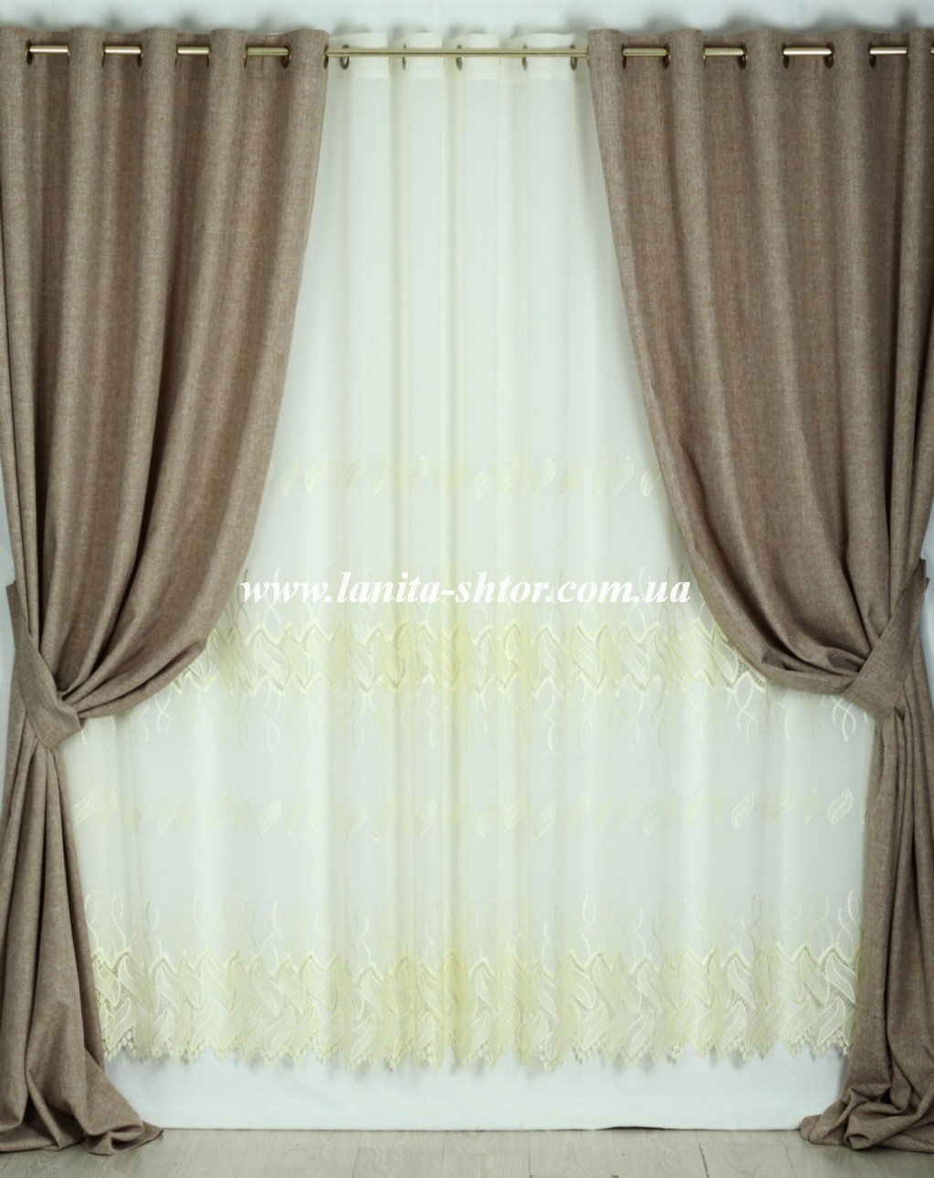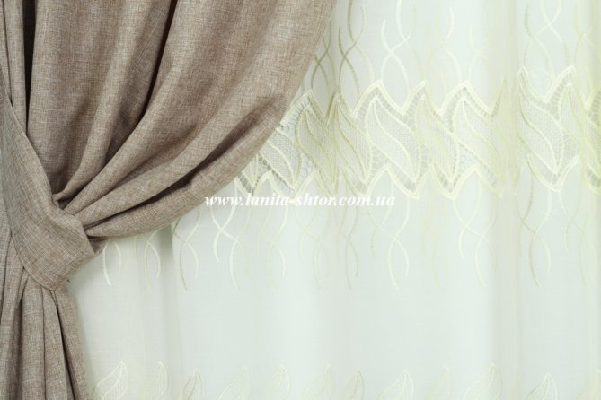 Тюль лен молочного цвета с вышитыми узорами и кружевными вставками. Благодаря блестящему волокну шитья, лиственные мотивы смотрятся отчетливо и нежно на фактурном матовом фоне. Основа гардины — полупрозрачная ткань с выразительной льняной структурой ткацкого плетения. Ткань достаточно мягкая и податливая, идеальная для создания красивых и ровных драпировок.