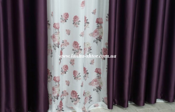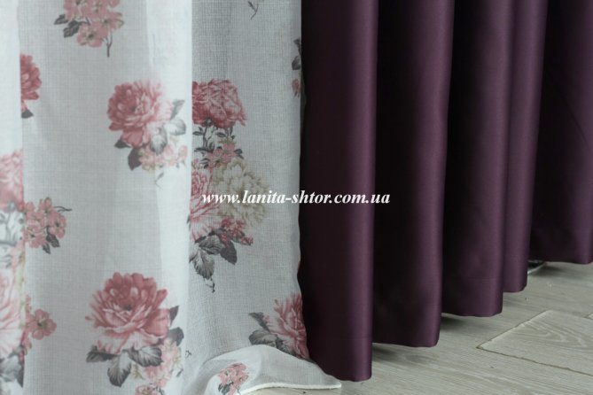 Нежная, белая гардина из льна с крупными розовыми цветами. Рисунок на ткань нанесен по типу купона, то есть более насыщенный узор приходится на нижнюю часть полотна. Основа тюля представляет собой легкую, полупрозрачную ткань с матовой поверхностью и ярко выраженным структурным плетением нитей. Гардина смотрится свежо и живописно, придает интерьеру романтическую атмосферу.
