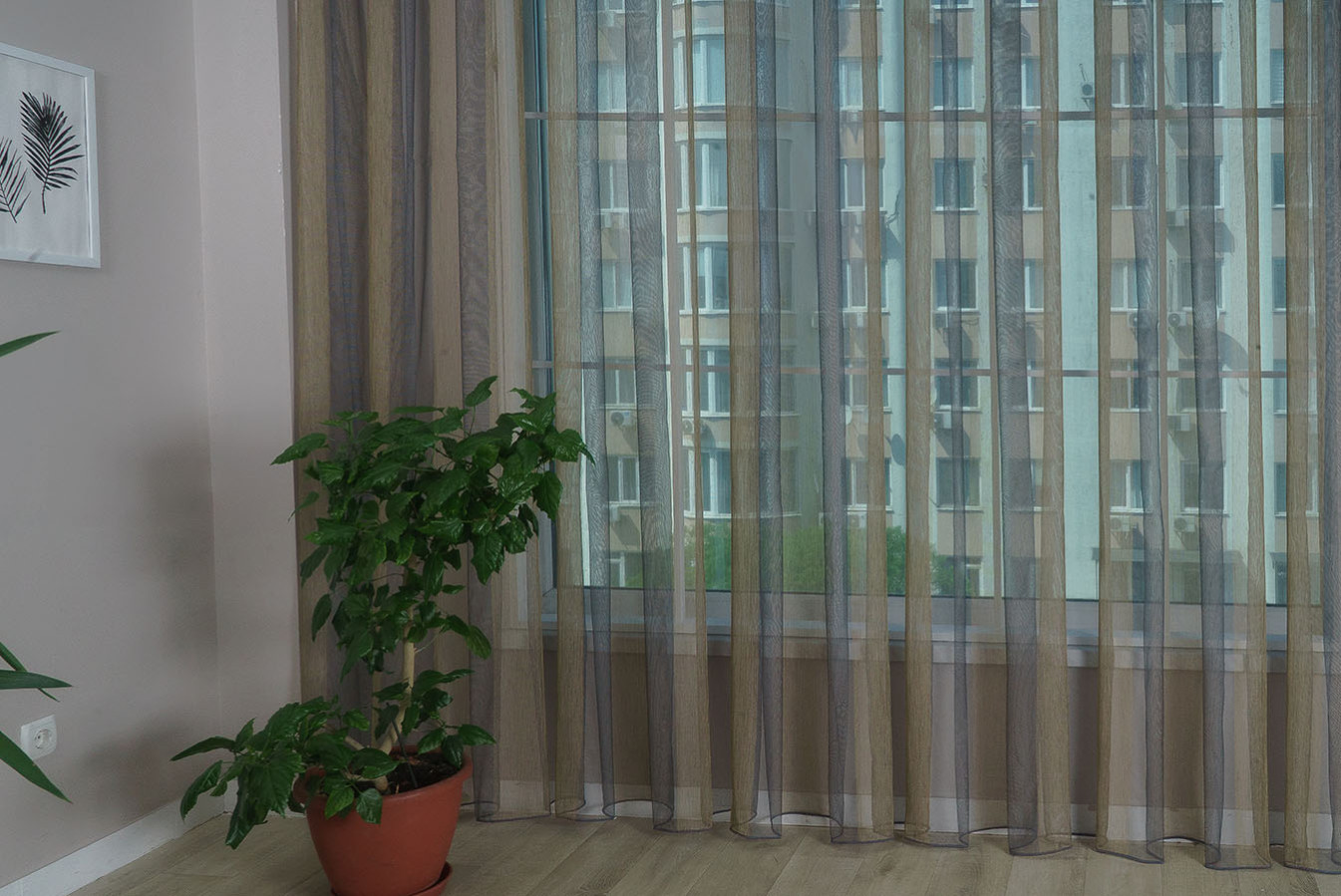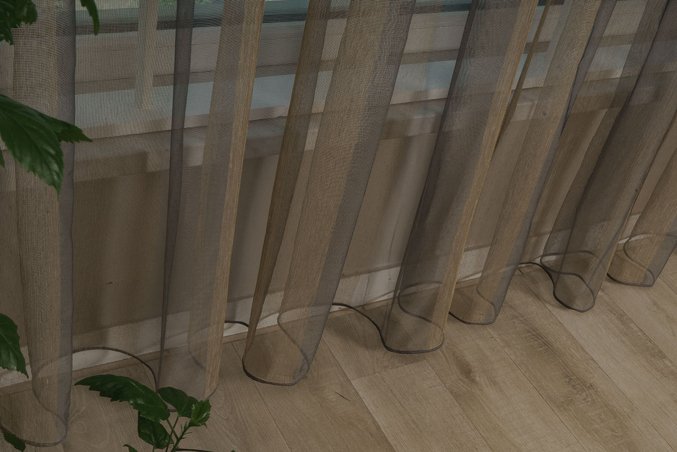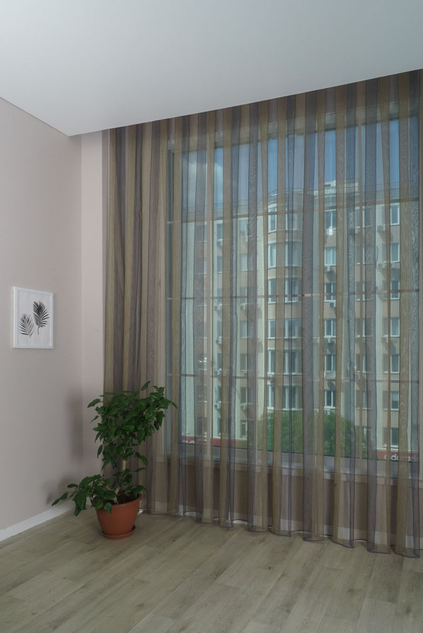 Льняной тюль микросетка турецкого производства с широкими вертикальными полосками. Легкий сетчатый фон имеет теплый шоколадный оттенок, а полоски выполнены путем включения в структуру утолщенных золотистых нитей. Такое исполнение декора делает полосатый узор достаточно заметным и выразительным. Эта воздушная и полупрозрачная ткань характеризуется отличными "дышащими" свойствами. А драпировки получаются мягкими, нежными и формоустойчивыми.