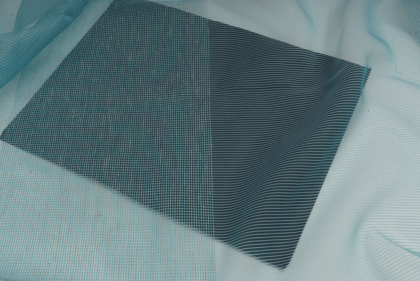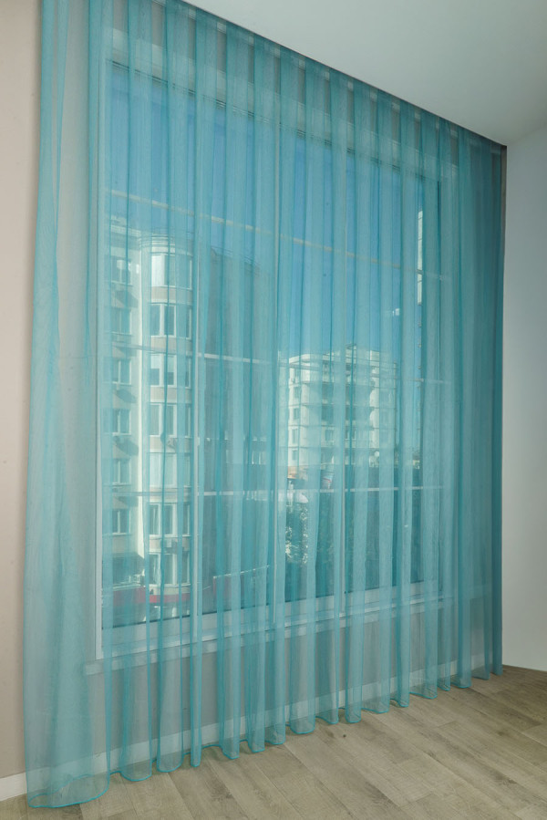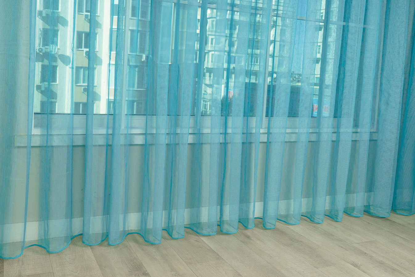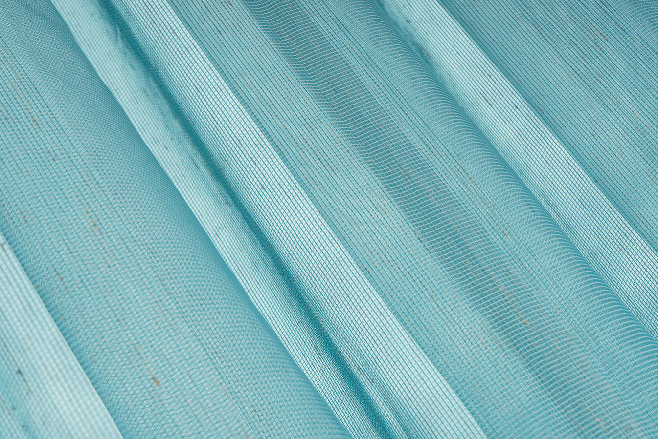 Сетчатый тюль лен турецкого производства бирюзового оттенка. На ткани присутствует полосатый вертикальный узор, выполненный благодаря вплетению утолщенных нитей в легкую и полупрозрачную сетчатую основу. Полоски смотрятся не броско, и лишь придают драпировкам гардины более глубокий и выразительный вид. Материал отлично "дышит" и хорошо держит форму складок.