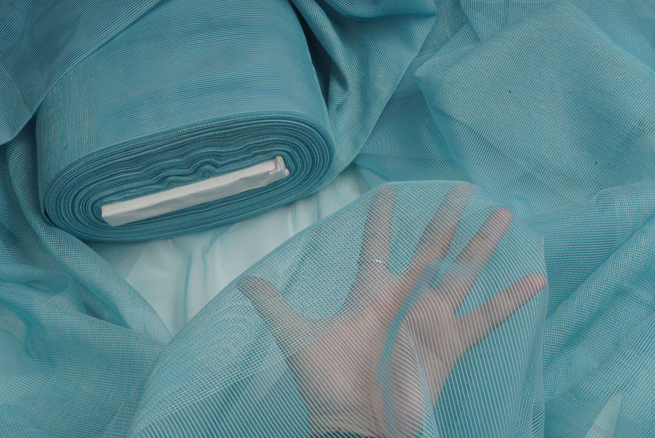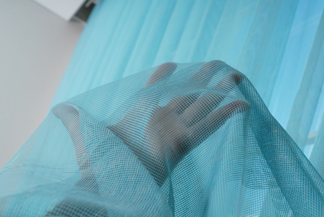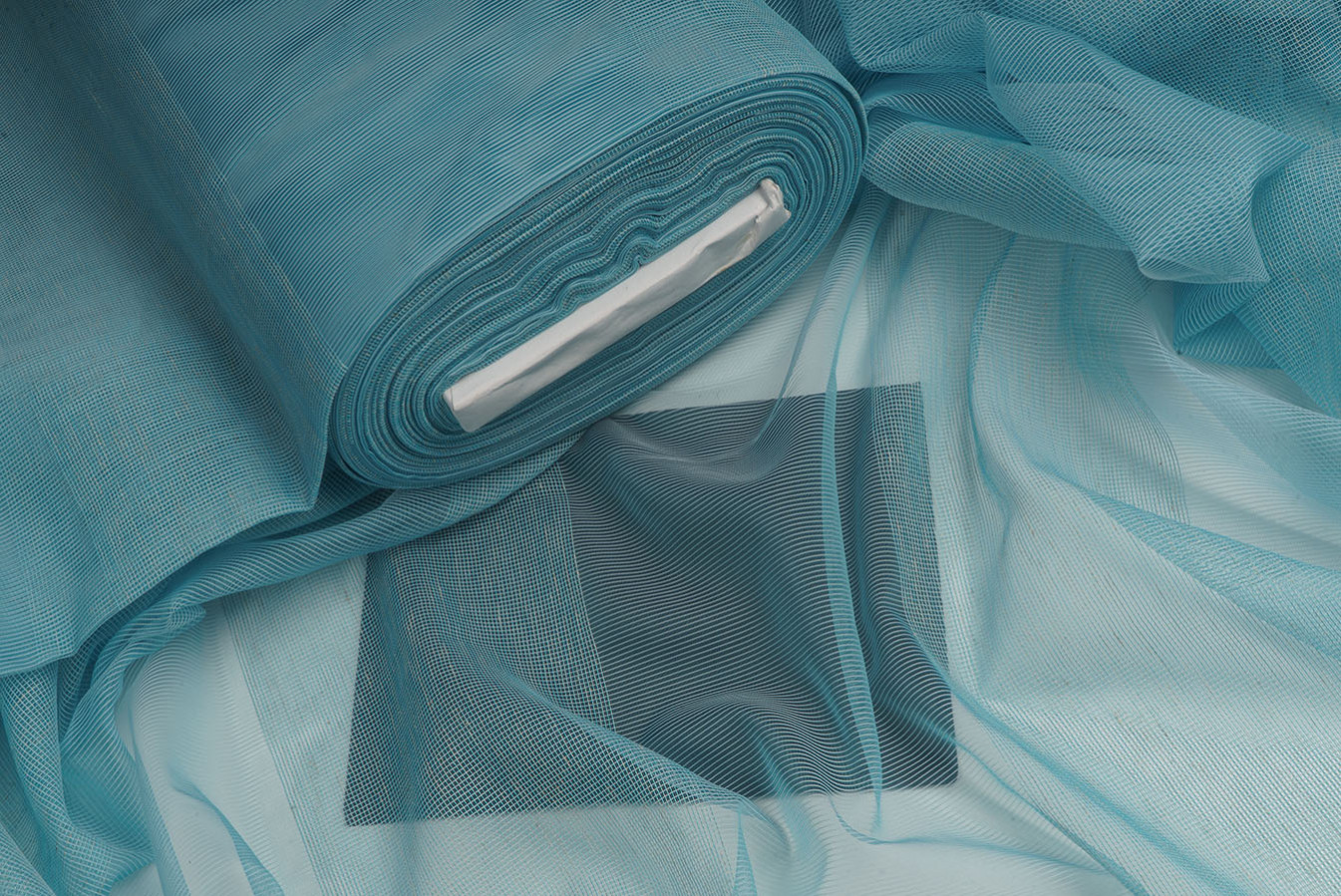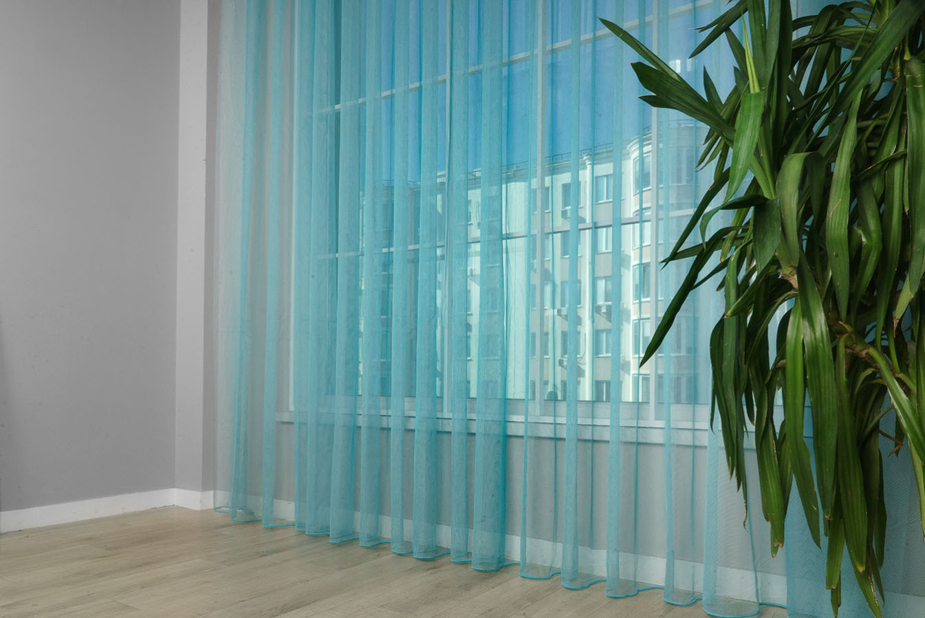 Сетчатый тюль лен турецкого производства бирюзового оттенка. На ткани присутствует полосатый вертикальный узор, выполненный благодаря вплетению утолщенных нитей в легкую и полупрозрачную сетчатую основу. Полоски смотрятся не броско, и лишь придают драпировкам гардины более глубокий и выразительный вид. Материал отлично "дышит" и хорошо держит форму складок.