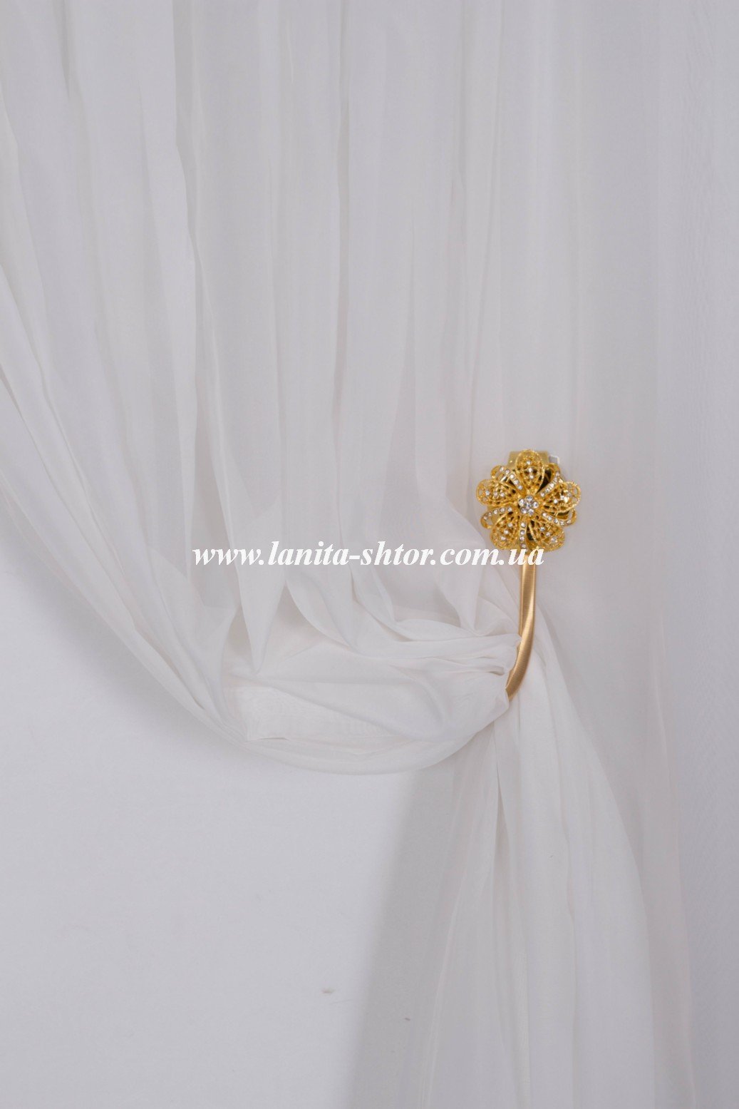 Магнит для штор с золотистым цветком в форме лютика. Декор этого магнитного подвеса похож на изящную брошку и служит прекрасным украшением для любой портьерной ткани. Белые, сияющие стразы придают аксессуару изысканный блеск и благородный вид. А стойкое золотое покрытие будет радовать глаз долгое время. Просто зафиксируйте драпировку с помощью магнита и наслаждайтесь новым и стильным видом ваших окон!