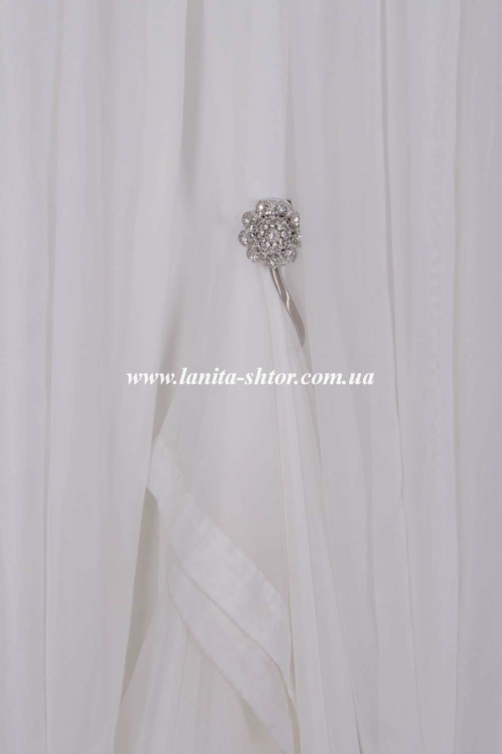 Серебристый магнит для штор, украшенный белыми прозрачными стразами. Лицевую часть магнита украшает брошка в виде красивого цветка. А яркое сияние камней выгодно подчеркивает блеск серебряного покрытия и дарит невероятно эффектные, искрящиеся блики. Аксессуар состоит их двух магнитных частей, соединенных гибким пояском, играющим роль подхвата для ткани. Магнит надежно фиксирует любые шторы и придает оформлению окон эксклюзивный и неповторимый вид.