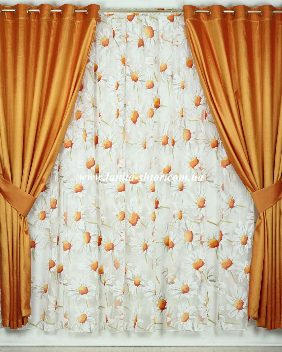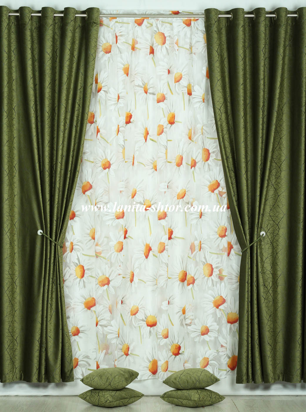 Тюль деворе с ярким и контрастным цветочным узором на основе прозрачной органзы. Крупные, густо расположенные ромашки, смотрятся объемно и реалистично, благодаря специальной технологии нанесения узора — деворе. Структура элементов узора намного более плотная, чем основа, что создает видимость парящих в воздухе цветов. Гардина на окнах смотрится очень красочно и живописно, придает обстановке свежее и летнее настроение.