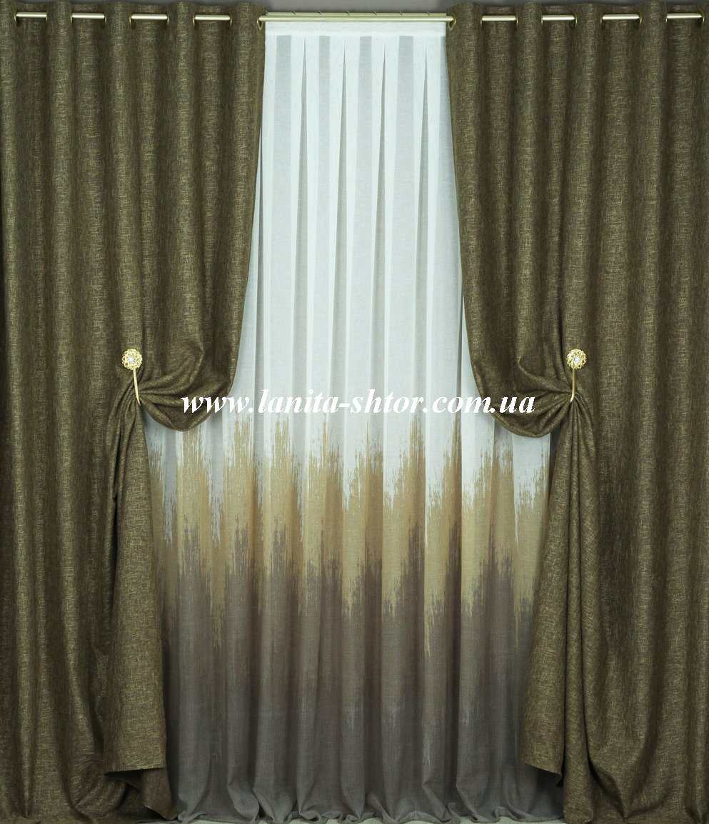 Гардина турецкого производства на основе льна с растяжкой абстрактного узора. Расцветка выполнена в виде зигзагообразного градиента перетекающих оттенков бронзово-коричневой гаммы. Основа тюля — полупрозрачная, струящаяся ткань полотняного плетения, в структуре которой присутствуют утолщенные нити, создающие выразительную и фактурную поверхность. Модель смотрится очень необычно и эксклюзивно, подходит для декора окон без использования штор.