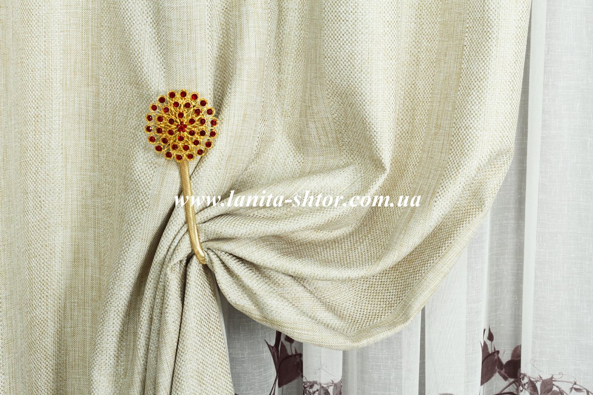 Магнит для штор Пион в форме круглой брошки. Этот изящный аксессуар совмещает надежность, практичность и необычайную красоту декоративной составляющей. Мерцание камней рубинового оттенка выгодно оттеняется золотистым цветом металлической основы. А благородный блеск оправы придает изделию особенно богатый и респектабельный вид. Просто закрепите драпировку штор с помощью этого магнита и наслаждайтесь стильным и красивым зрелищем))