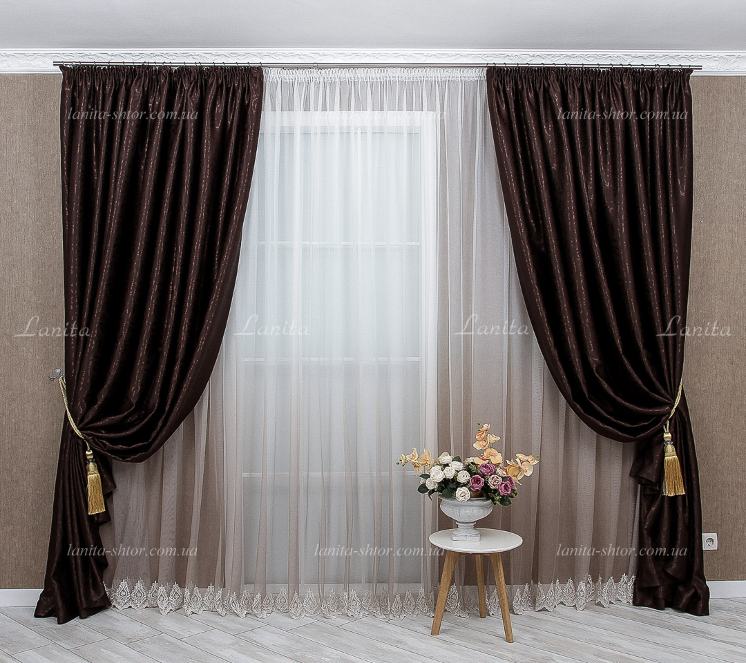 Двухсторонние шторы блэкаут с вензелями в темно-коричневом, шоколадном оттенке. Обе стороны ткани имеют декоративную поверхность, выполненную благодаря инверсионному переплетению матовых и глянцевых волокон. По своей структуре это трехслойный материал, где внутренний слой плетения черных нитей обеспечивает шторам дополнительную плотность и светозащитную функцию. Ткань не мнется и обладает высокой пластичностью, в драпировках ложится в глубокие, выразительные и красиво струящиеся воланы.