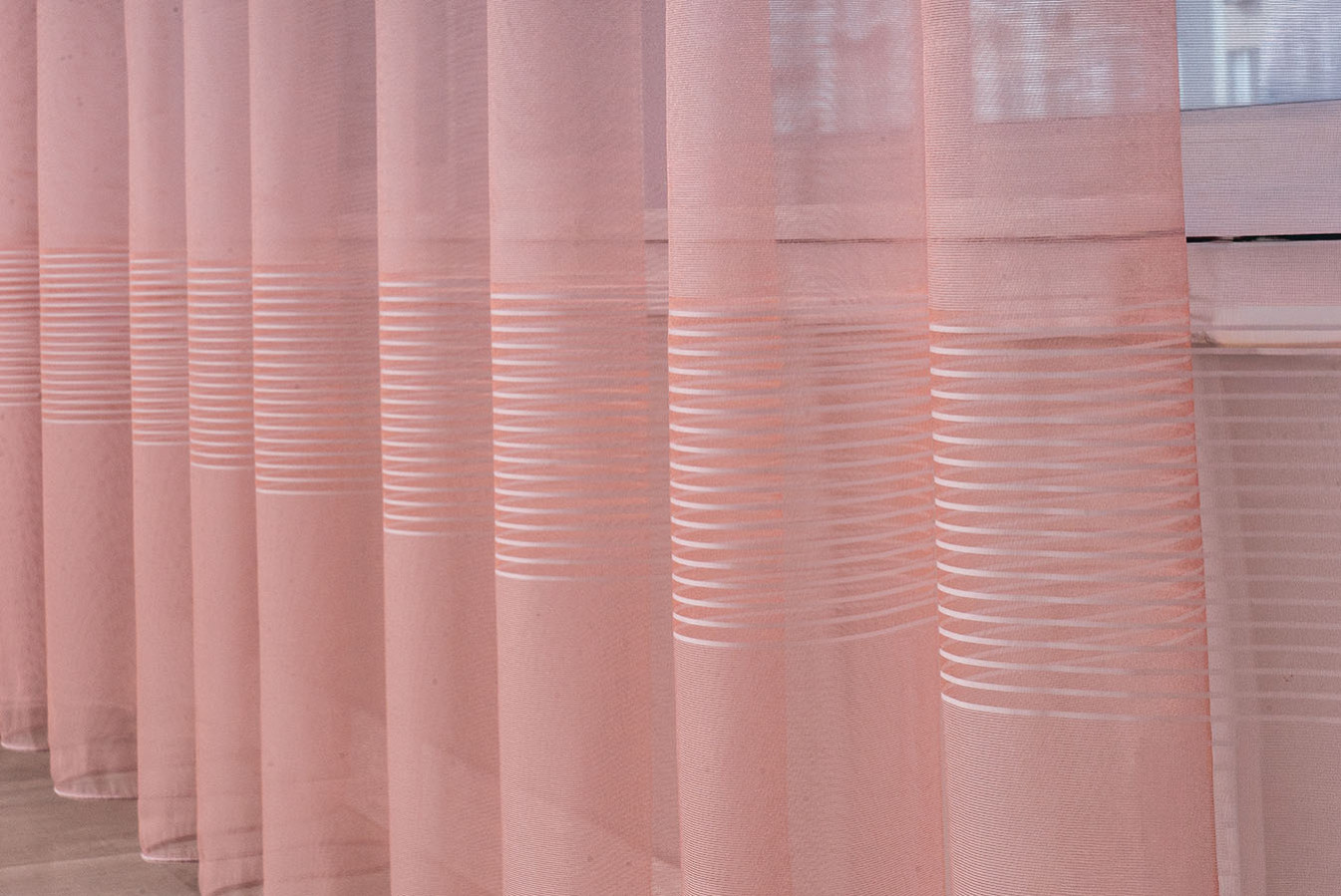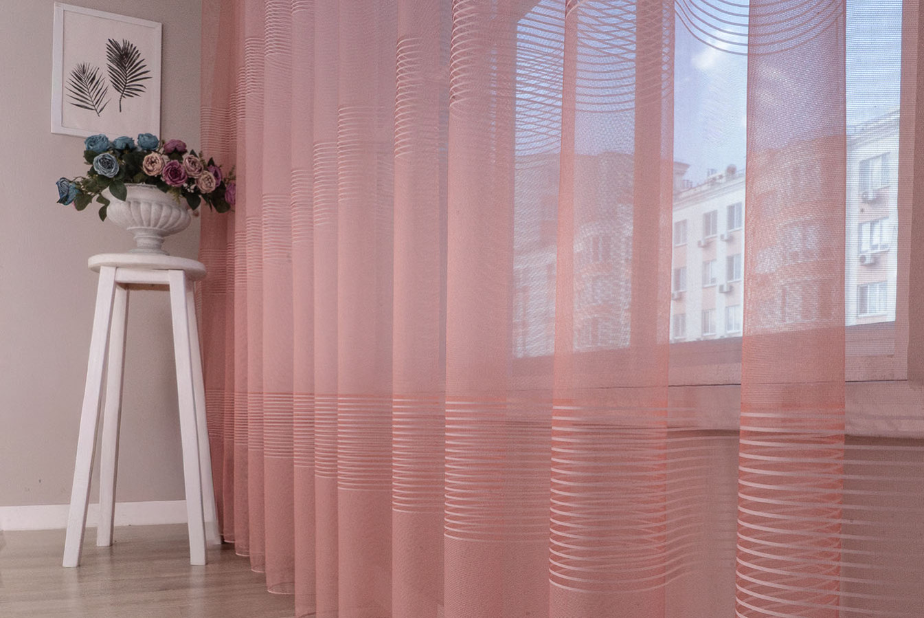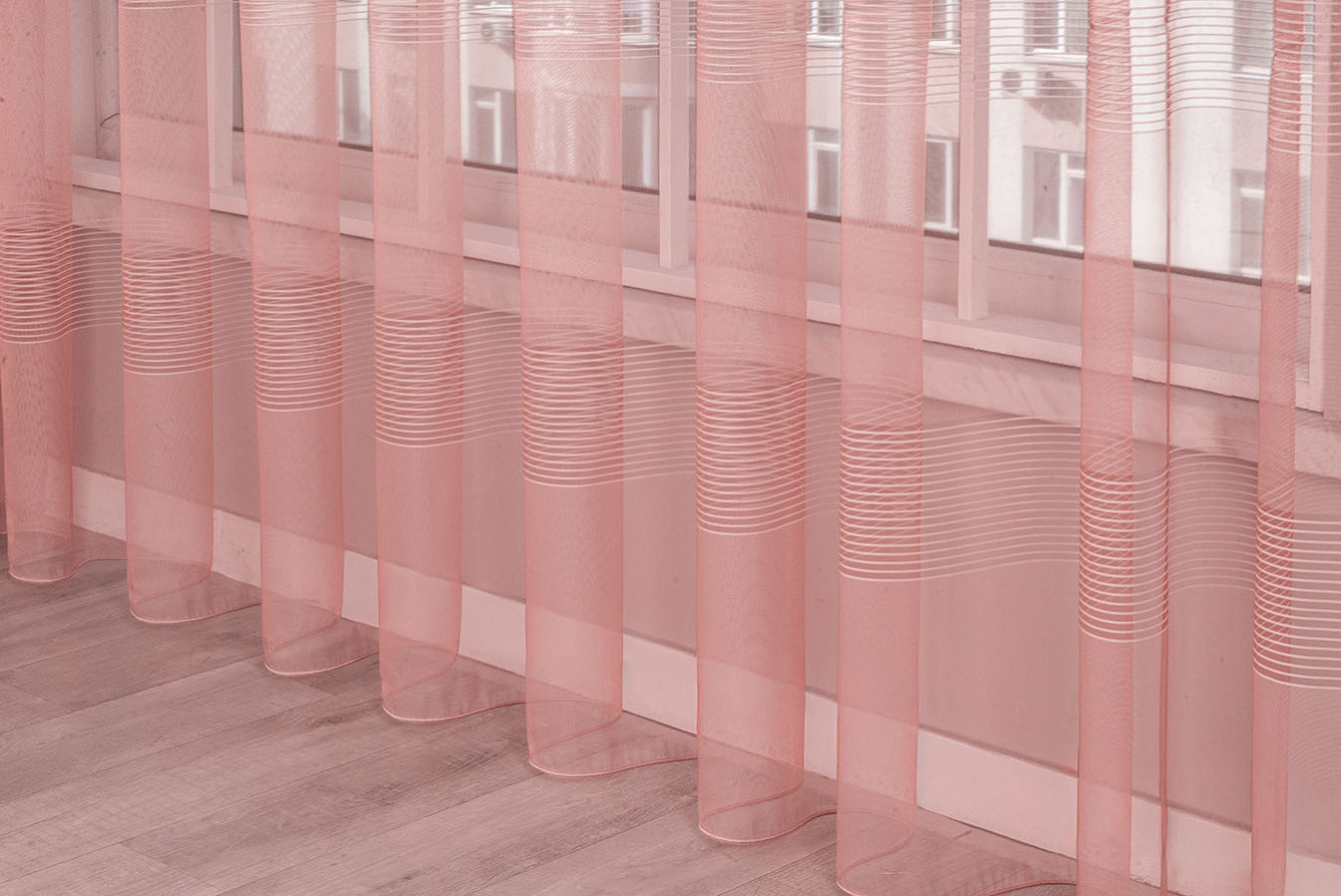 Турецкий тюль фатин в полоску пастельно-кораллового оттенка. Ткань характеризуется полупрозрачностью, мелкосетчатой структурой плетения, отлично пропускает воздух и мягко рассеивает свет. На ощупь — это материал средней жесткости, в драпировках образует устойчивые и объемные воланы. А шнур-утяжелитель по низу тюля придает складкам красивую округлую форму.