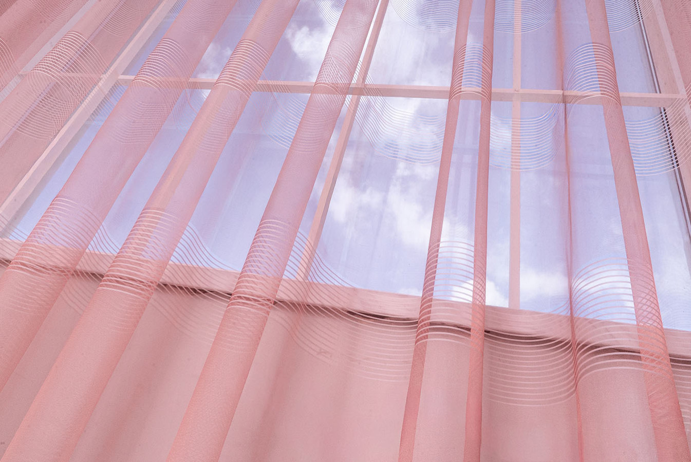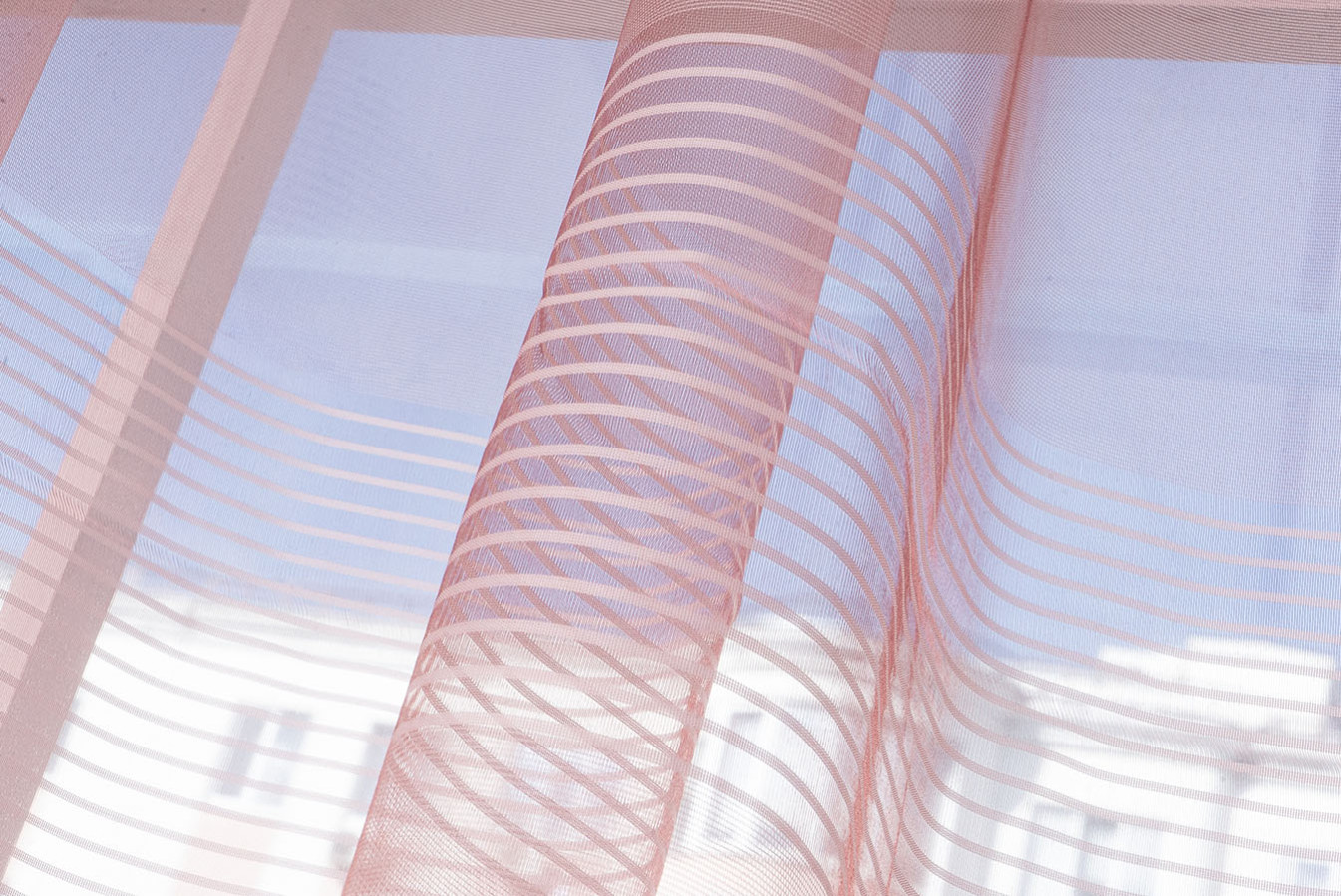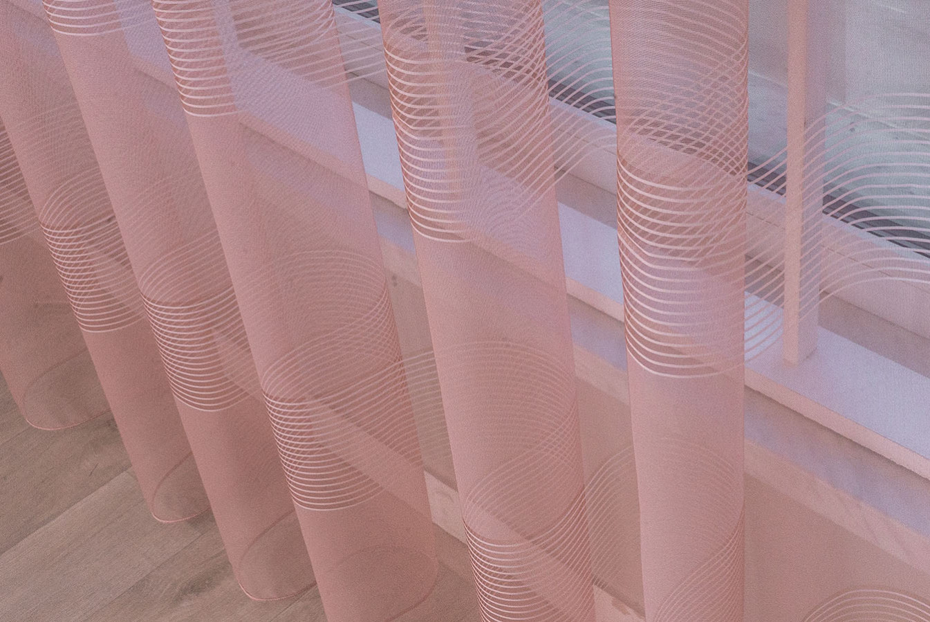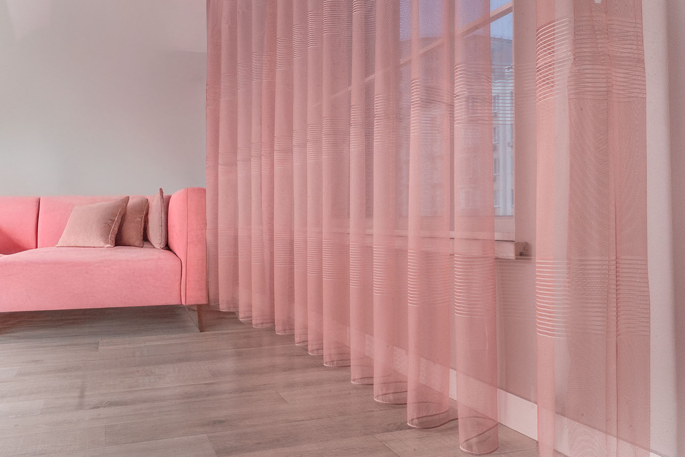 Турецкий тюль фатин в полоску пастельно-кораллового оттенка. Ткань характеризуется полупрозрачностью, мелкосетчатой структурой плетения, отлично пропускает воздух и мягко рассеивает свет. На ощупь — это материал средней жесткости, в драпировках образует устойчивые и объемные воланы. А шнур-утяжелитель по низу тюля придает складкам красивую округлую форму.