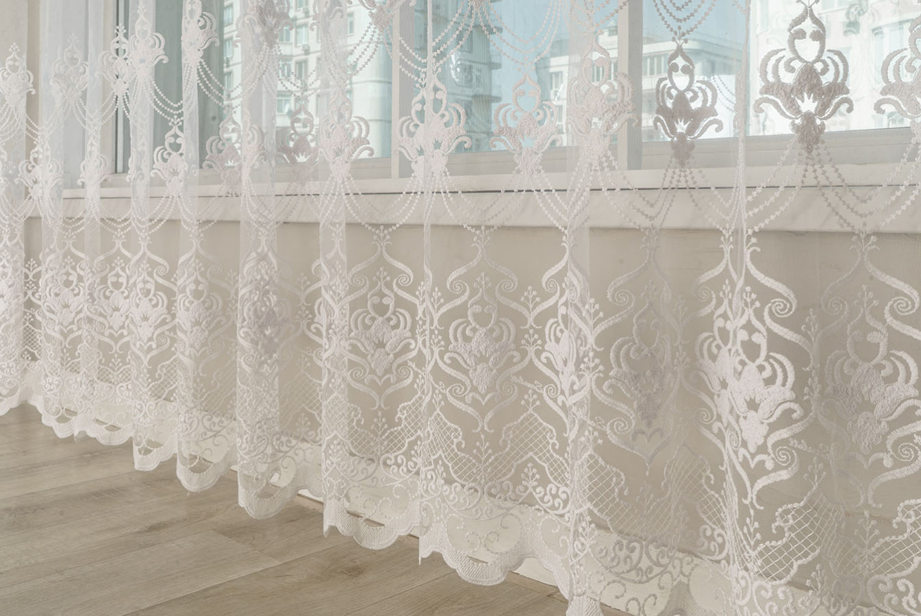 Нежная, изумительно красивая гардина турецкого производства, пошитая ручной закладкой. Чистый белый оттенок гардины вызывает ощущение свежести и прохлады. Плотная рельефная вышивка в виде вензелей смотрится очень отчетливо на полупрозрачном фоне фатина. Ажурное кружево по низу изделия придает ему еще более богатый и пышный вид, а также, выполняет роль утяжелителя тюля. Эта изящная и роскошная занавесь стоит того, чтобы украсить ее свою любимую комнату.