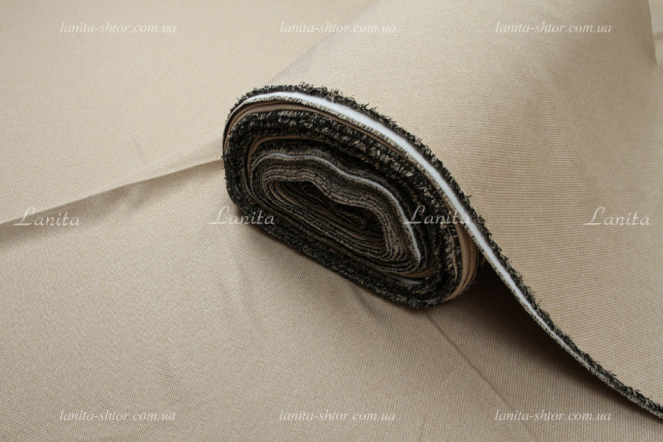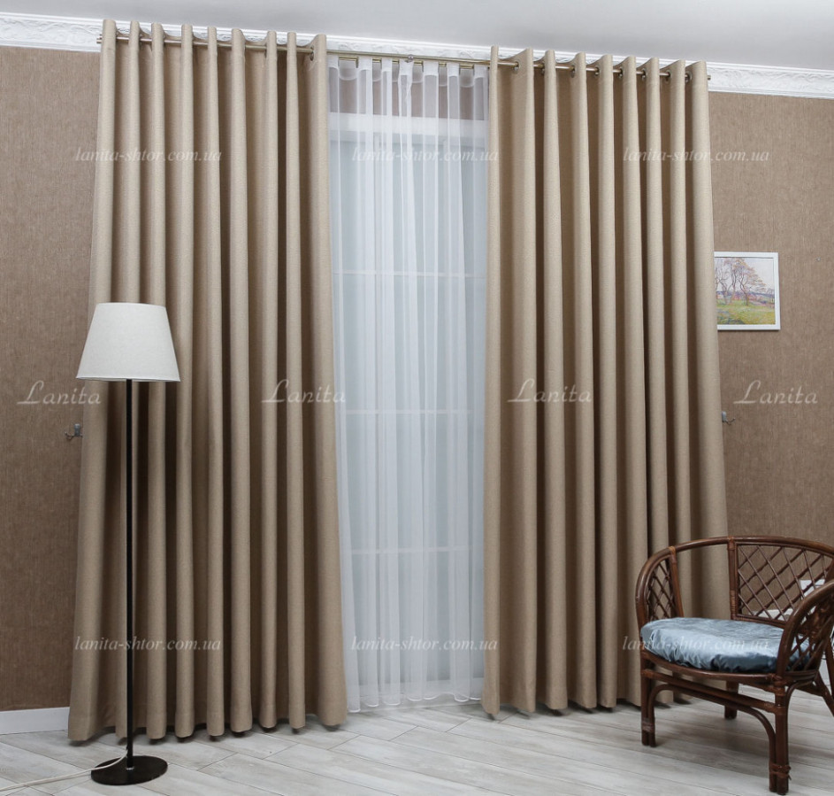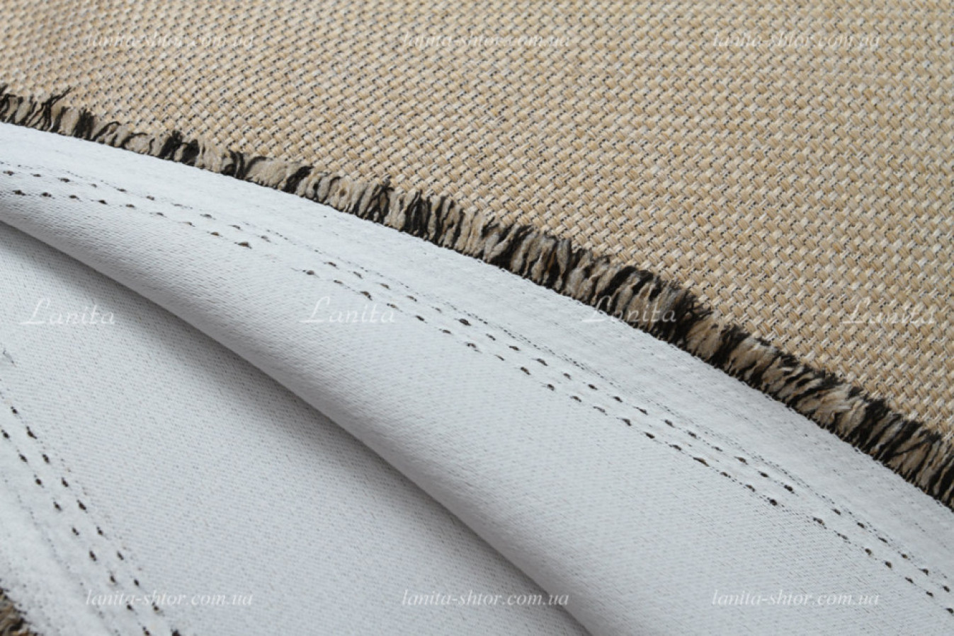 Бежевые шторы рогожка из плотной многослойной ткани. Лицевая сторона портьеры имеет выразительную фактурную поверхность, созданную благодаря переплетению утолщенных волокон по типу мешковины. Изнаночная сторона имеет гладкую белую поверхность с матовым отливом. Включенные в структуру ткани волокон различного оттенка, придают узору переплетения еще большую выразительность и рельефность. Это одна из самых популярных коллекций штор, привлекающая внимание стильным и самобытным внешним видом.