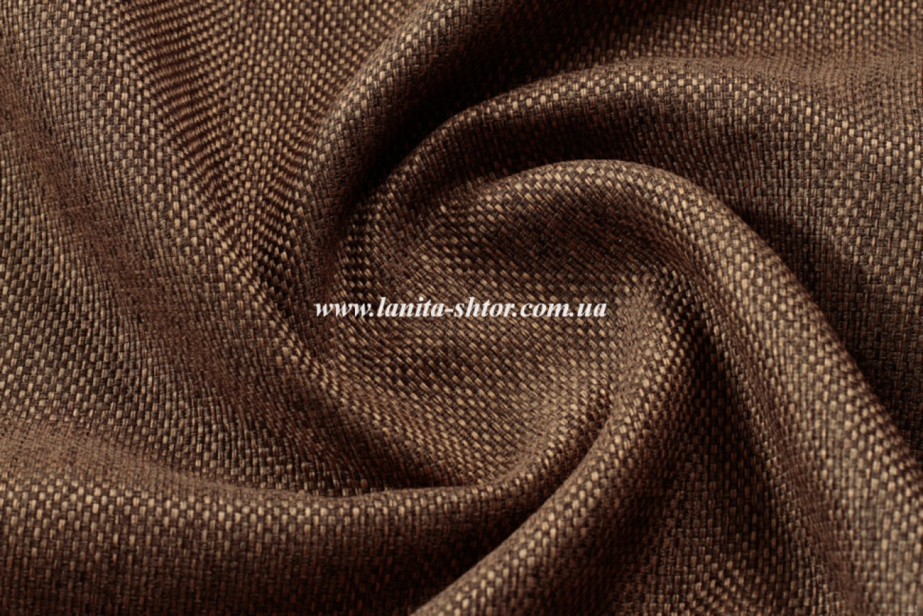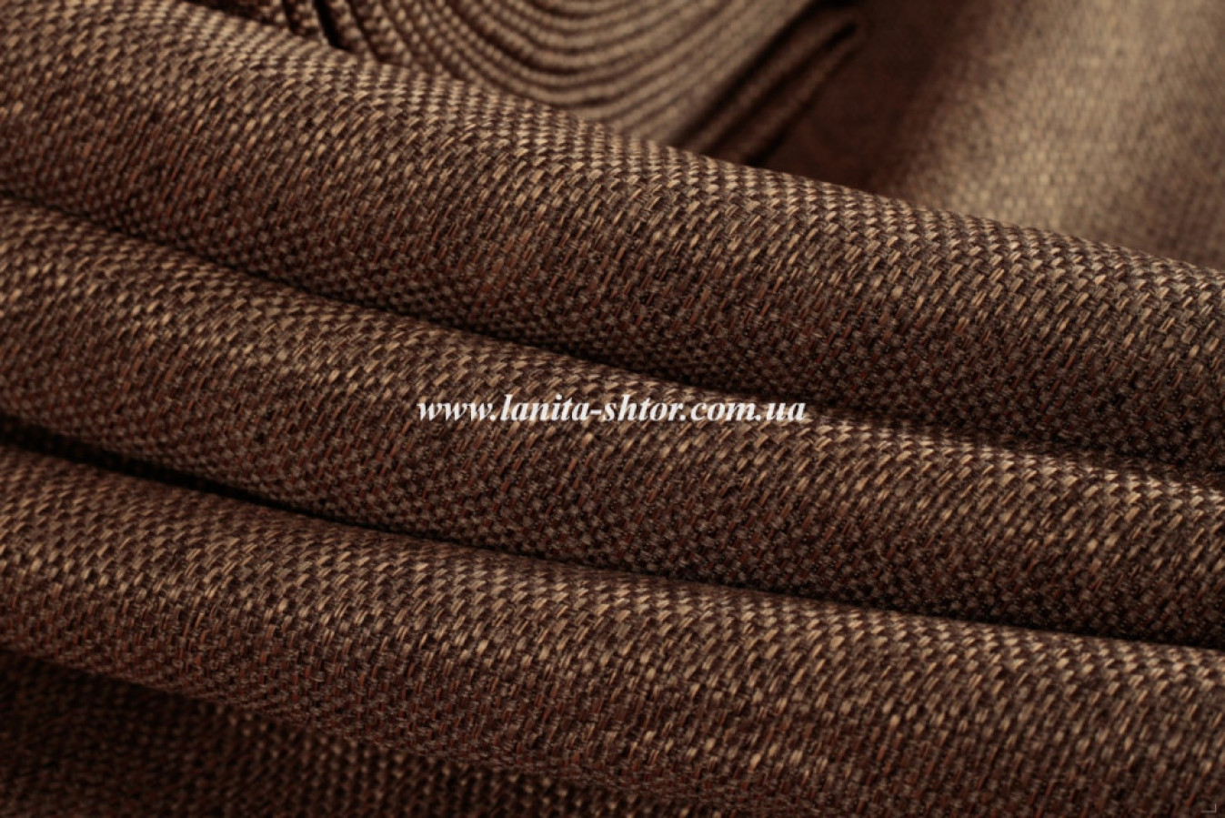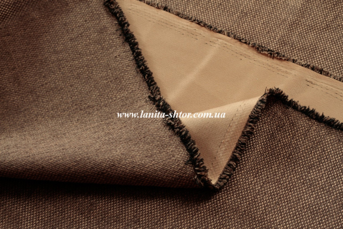 Плотные коричневые шторы с матовой поверхностью и фактурным плетением нитей, имитирующим рогожку. Лицевая сторона имеет колоритный вид натуральной домотканой ткани, а изнанка — гладкая, светло-коричневая. Структура шторы включает средний слой плетения черных нитей, который обеспечивает материалу светозащитные свойства. Такой элегантный материал для портьер, несомненно, станет изюминкой интерьера и подчеркнет утонченный вкус хозяев.