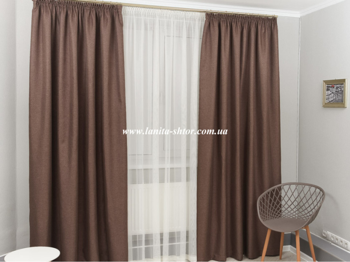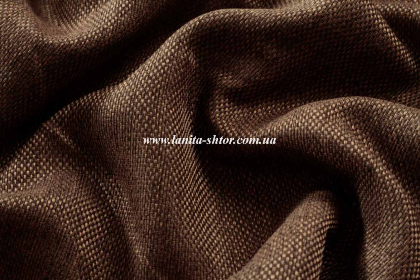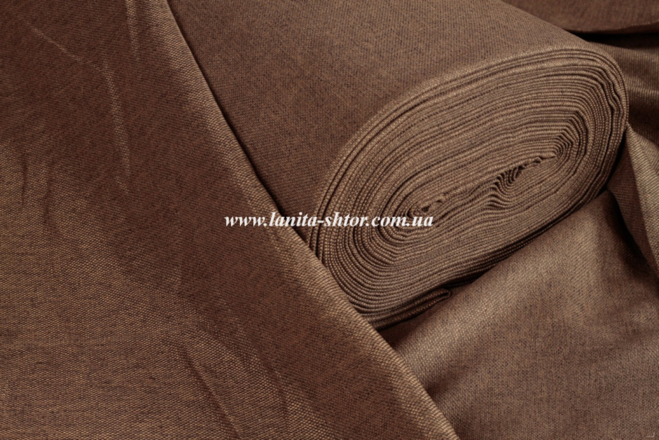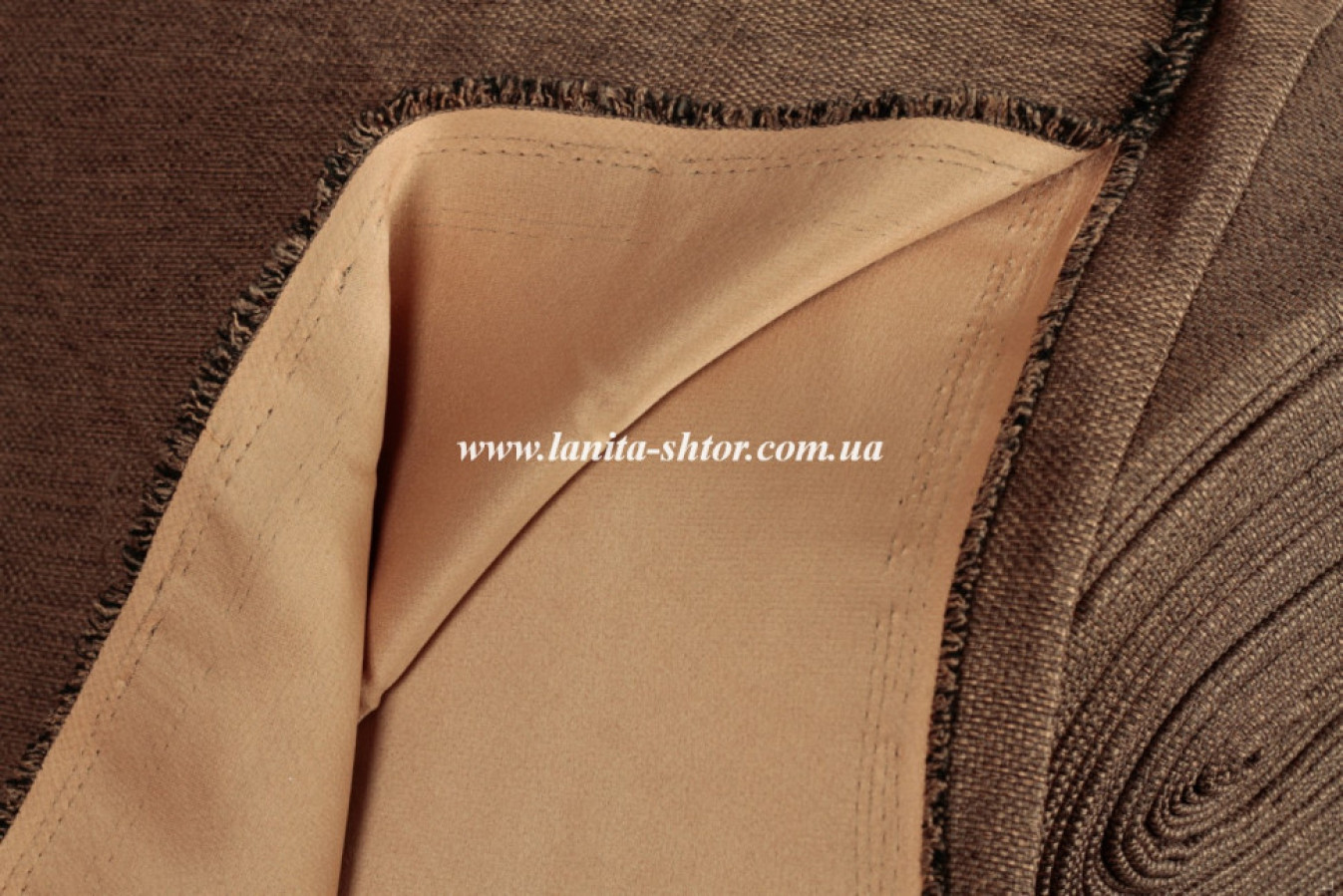 Плотные коричневые шторы с матовой поверхностью и фактурным плетением нитей, имитирующим рогожку. Лицевая сторона имеет колоритный вид натуральной домотканой ткани, а изнанка — гладкая, светло-коричневая. Структура шторы включает средний слой плетения черных нитей, который обеспечивает материалу светозащитные свойства. Такой элегантный материал для портьер, несомненно, станет изюминкой интерьера и подчеркнет утонченный вкус хозяев.