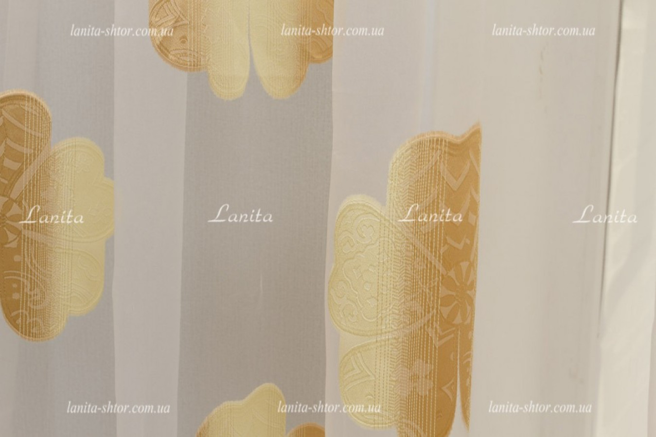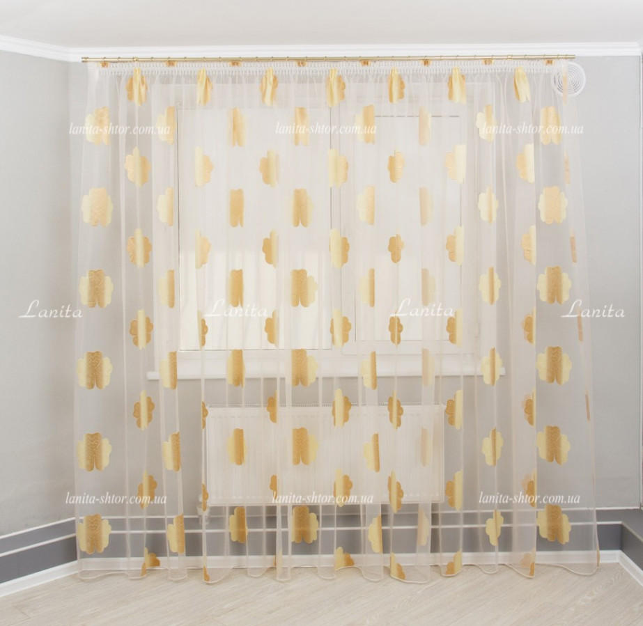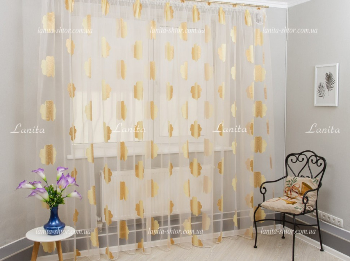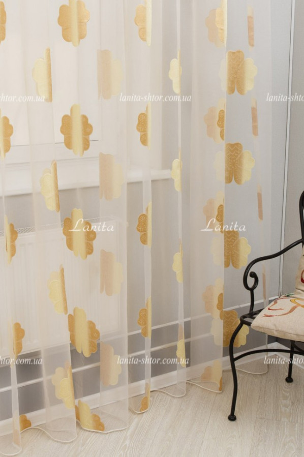 Легкая и воздушная гардина с крупными цветками в золотисто-карамельной расцветке. Тюль создан на основе органзы — легкой, прозрачной ткани с нежным восковым отливом на поверхности. Благодаря своей жесткости, тюль органза образует объемные и формоустойчивые фалды при драпировках. А ее выразительный декор создан путем фактурного вплетения шелковистых волокон в основу, в результате чего получились цветы с рельефной и мягко сияющей поверхностью.
