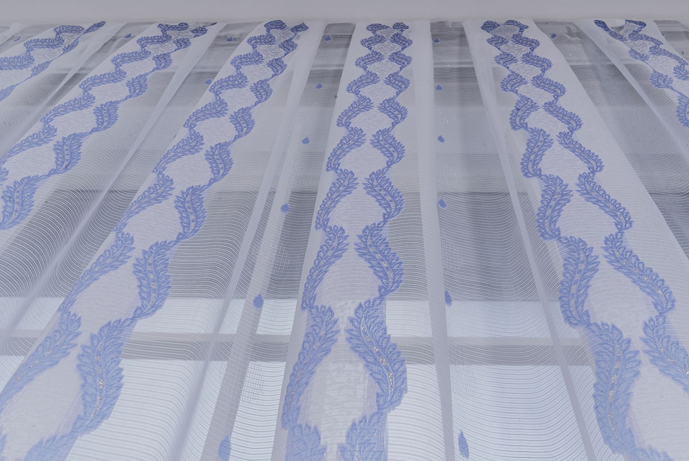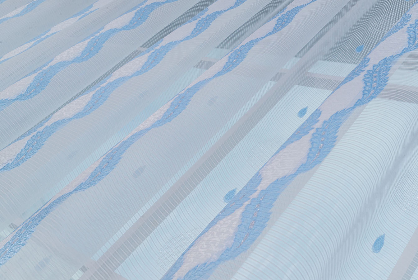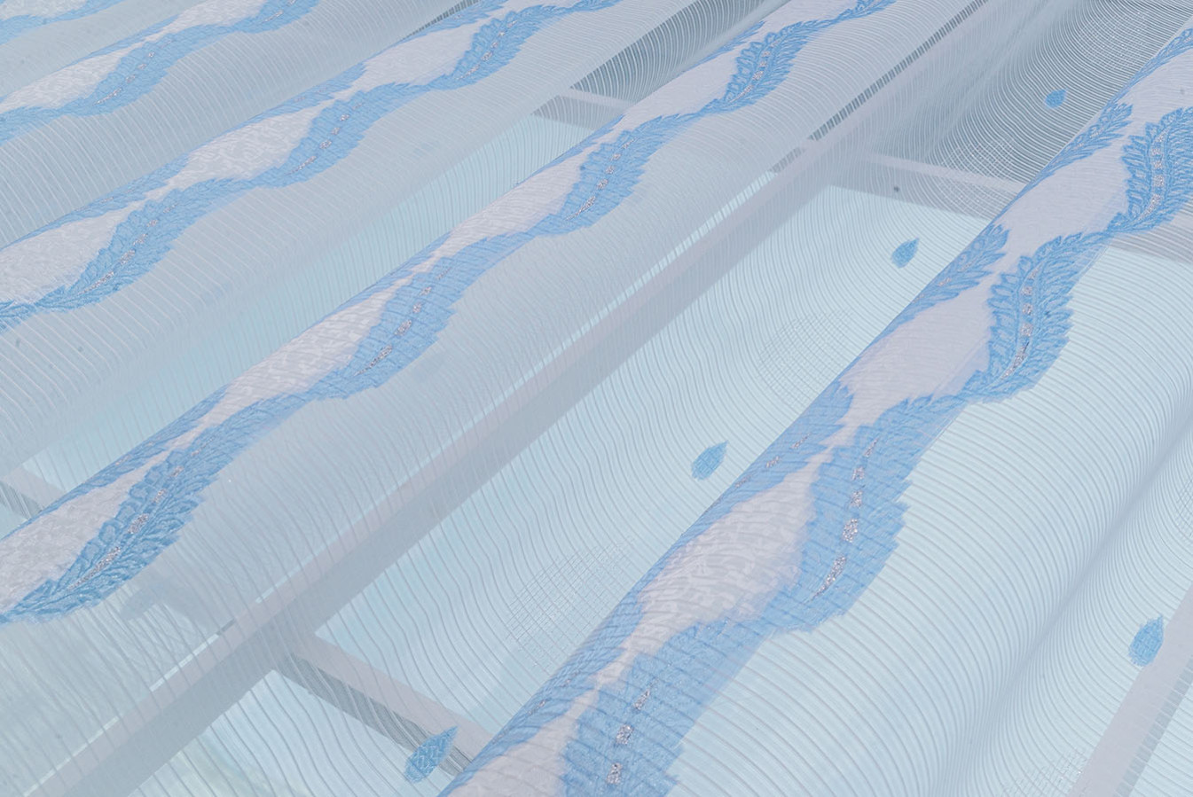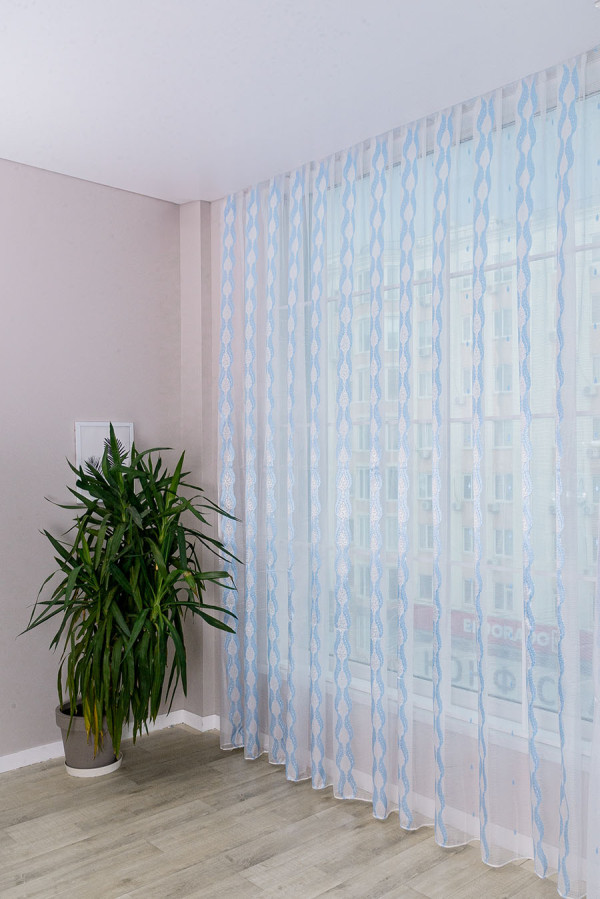 Красивая, нежная ткань для тюля в бело-голубой расцветке. Продольные полоски орнамента имеют рельефную, узорчатую поверхность, отливающую глянцевым сиянием. Узор украшает и освежает однотонность белого фона с необычной структурой в виде микрополос. В драпировках гардина ложится в мягкие, красивые складки устойчивой формы. Это прекрасный и доступный вариант эффектно украсить окно в любой комнате: кухне, спальне, детской или гостиной.