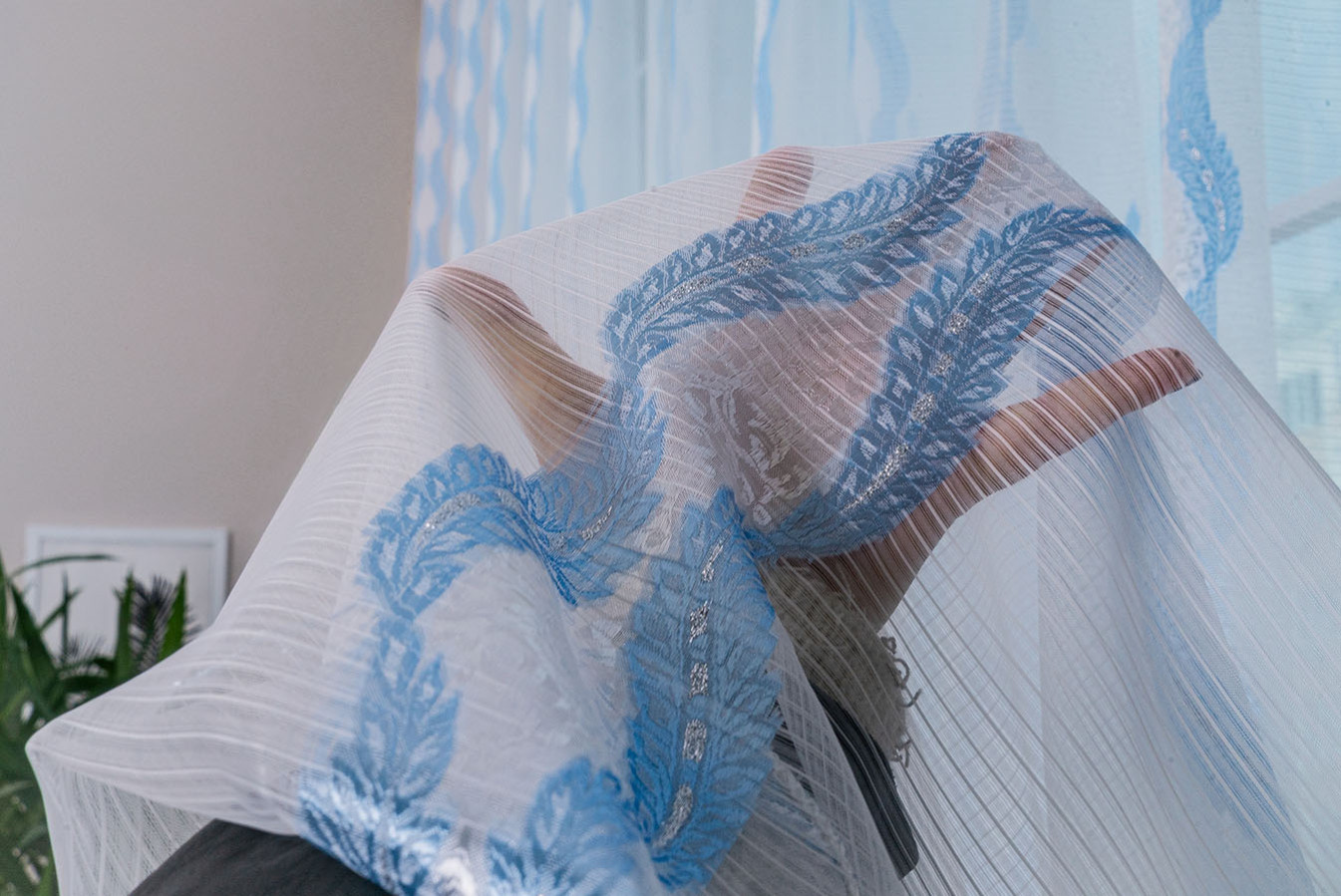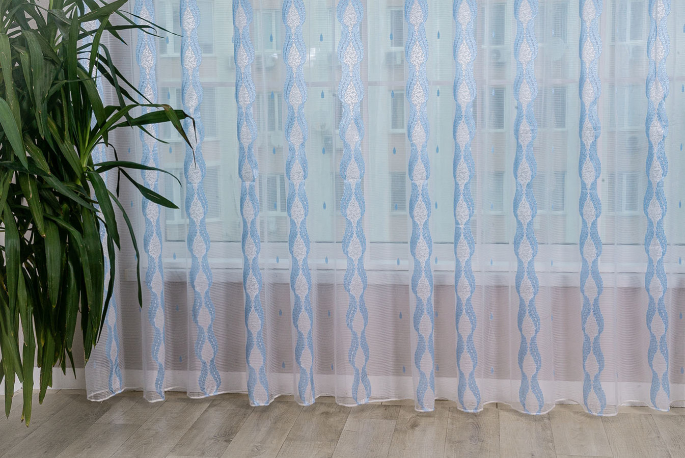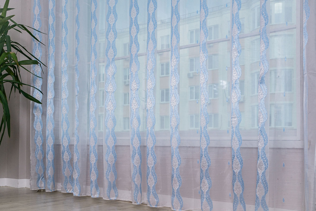 Красивая, нежная ткань для тюля в бело-голубой расцветке. Продольные полоски орнамента имеют рельефную, узорчатую поверхность, отливающую глянцевым сиянием. Узор украшает и освежает однотонность белого фона с необычной структурой в виде микрополос. В драпировках гардина ложится в мягкие, красивые складки устойчивой формы. Это прекрасный и доступный вариант эффектно украсить окно в любой комнате: кухне, спальне, детской или гостиной.