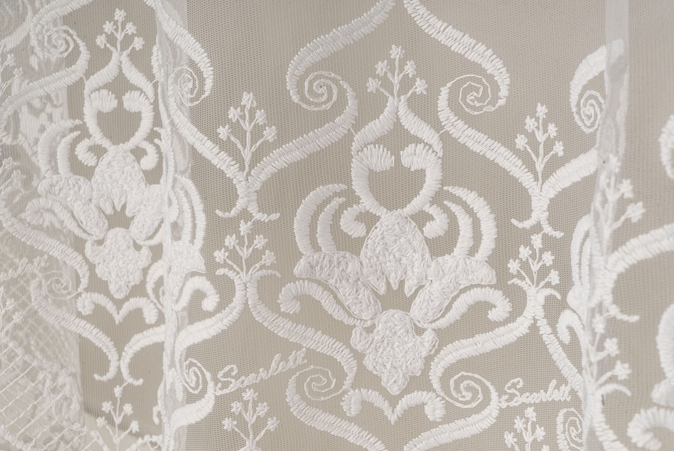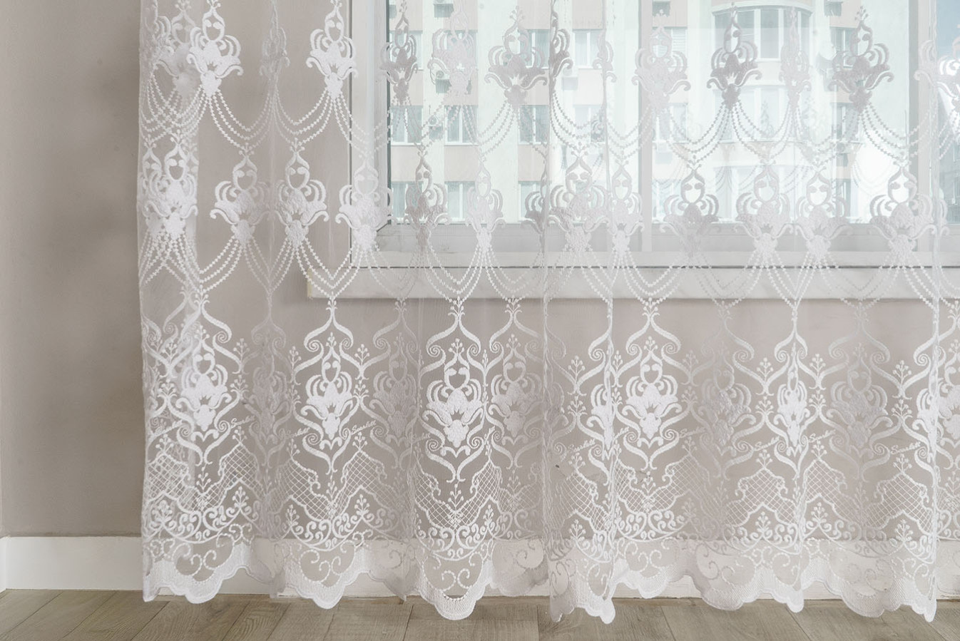 Нежная, изумительно красивая ткань для тюля турецкого производства. Чистый белый оттенок гардины вызывает ощущение свежести и прохлады. Плотная рельефная вышивка в виде вензелей смотрится очень отчетливо на полупрозрачном фоне фатина. Ажурное кружево по низу изделия придает ему еще более богатый и пышный вид, а также, выполняет роль утяжелителя тюля. Эта изящная и роскошная занавесь стоит того, чтобы украсить ее свою любимую комнату.