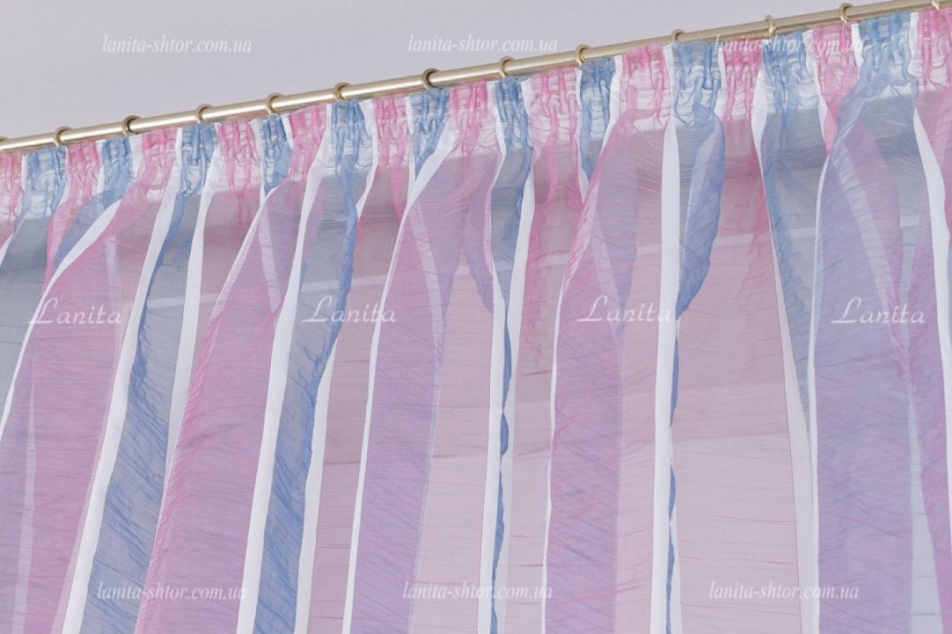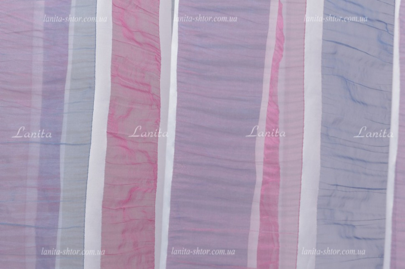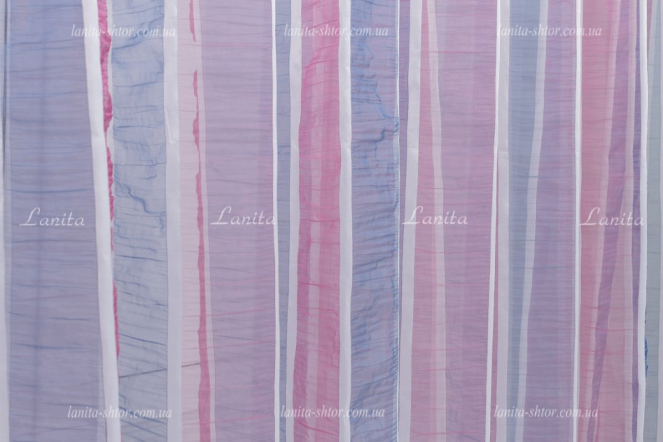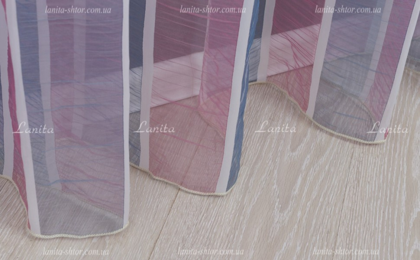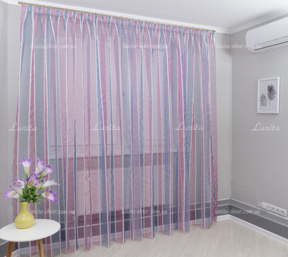 Тюль органза с вертикальными полосками в сиренево-фиолетовой гамме. Ткань характеризуется легкостью, полупрозрачностью и нежным отблеском на поверхности. Жесткость органзы способствует созданию пышных и воздушных складок при драпировках. Тюль выглядит нежно и живописно, отлично освежает и украшает любой интерьер.