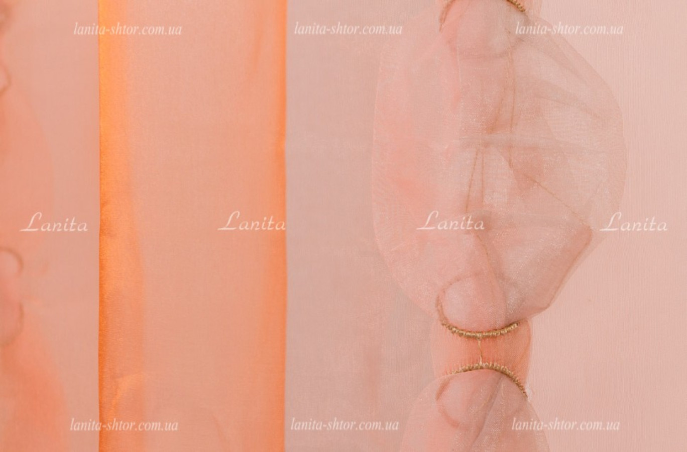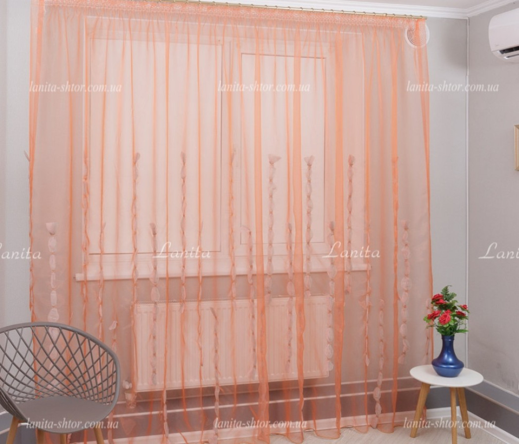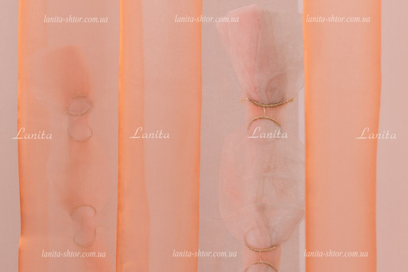 Тюль органза в абрикосово-персиковом оттенке с очень необычным и оригинальным дизайном. Декор тюля — розово-персиковые органзовые ленты, протянутые сквозь специальные отверстия. Отверстия аккуратно обработаны плотной строчкой золотистыми нитями. Благодаря такому исполнению, тюль приобрел выразительную и объемную поверхность. Смотрится воздушно и нежно, прекрасно освежает и украшает интерьер.