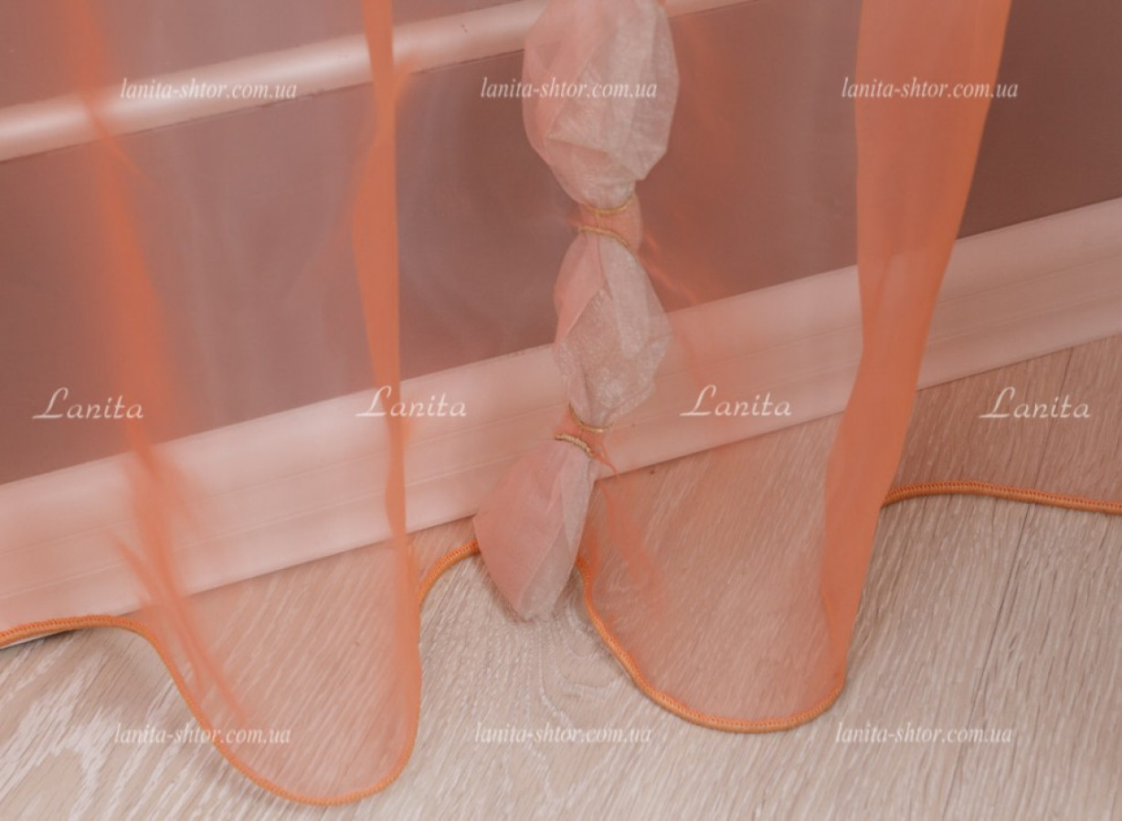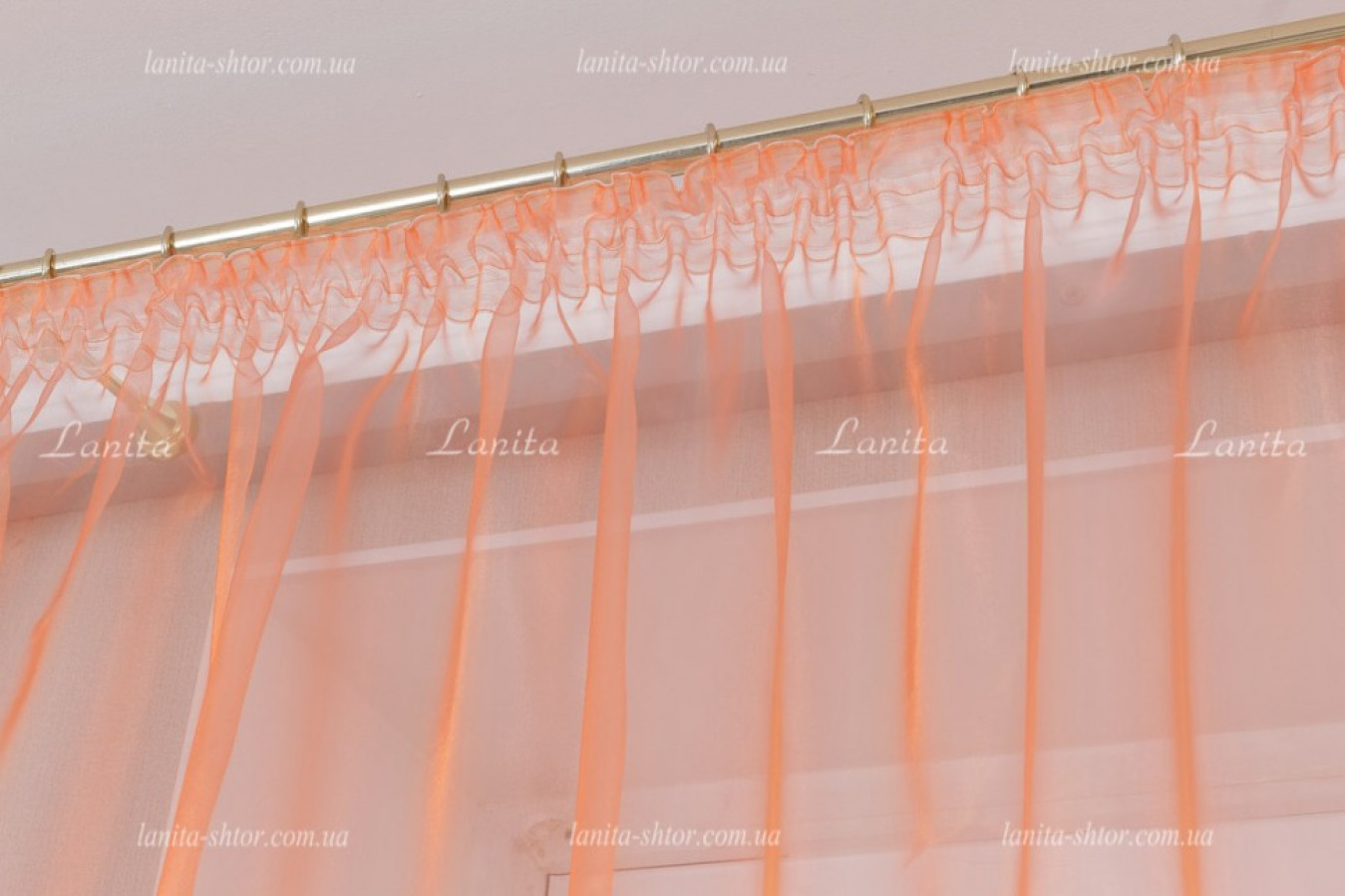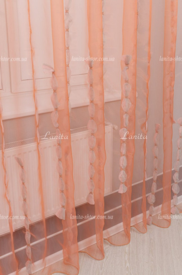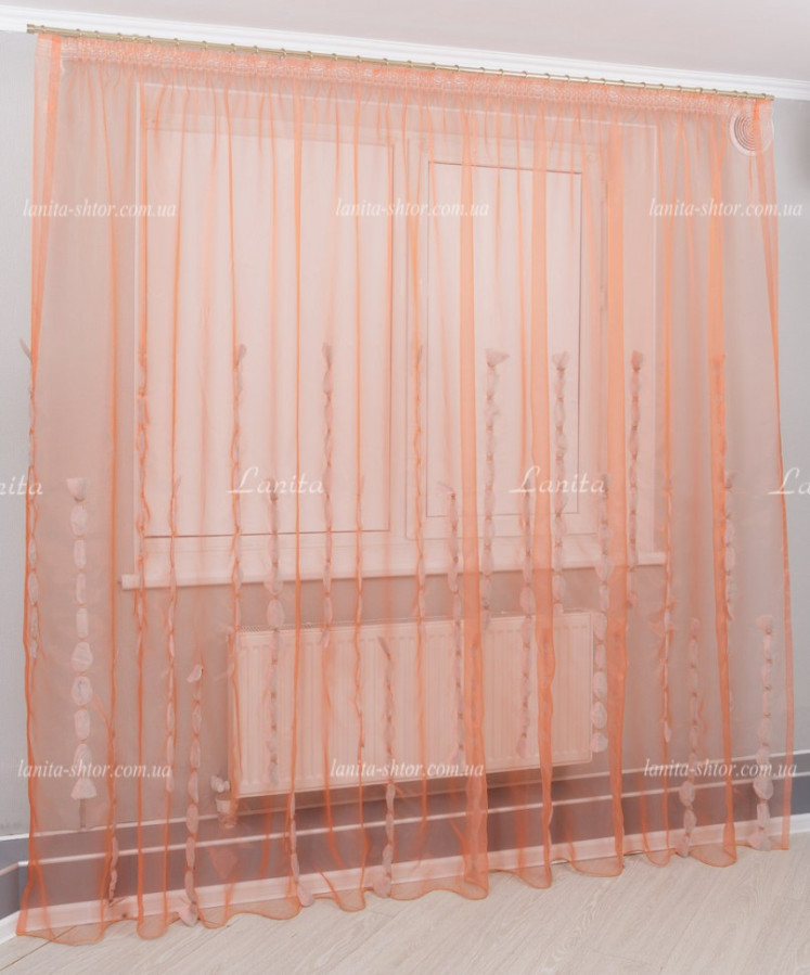 Тюль органза в абрикосово-персиковом оттенке с очень необычным и оригинальным дизайном. Декор тюля — розово-персиковые органзовые ленты, протянутые сквозь специальные отверстия. Отверстия аккуратно обработаны плотной строчкой золотистыми нитями. Благодаря такому исполнению, тюль приобрел выразительную и объемную поверхность. Смотрится воздушно и нежно, прекрасно освежает и украшает интерьер.