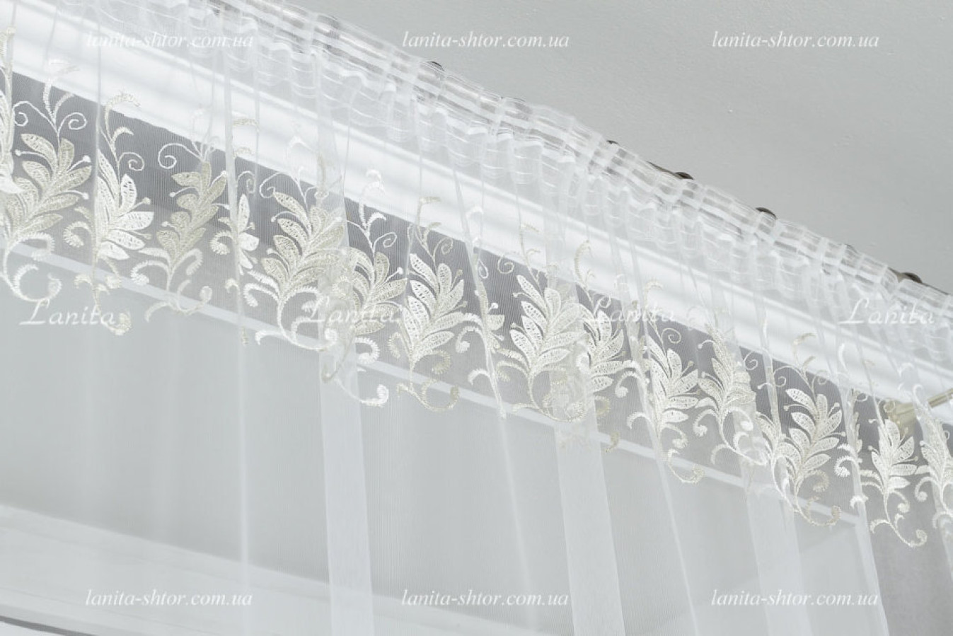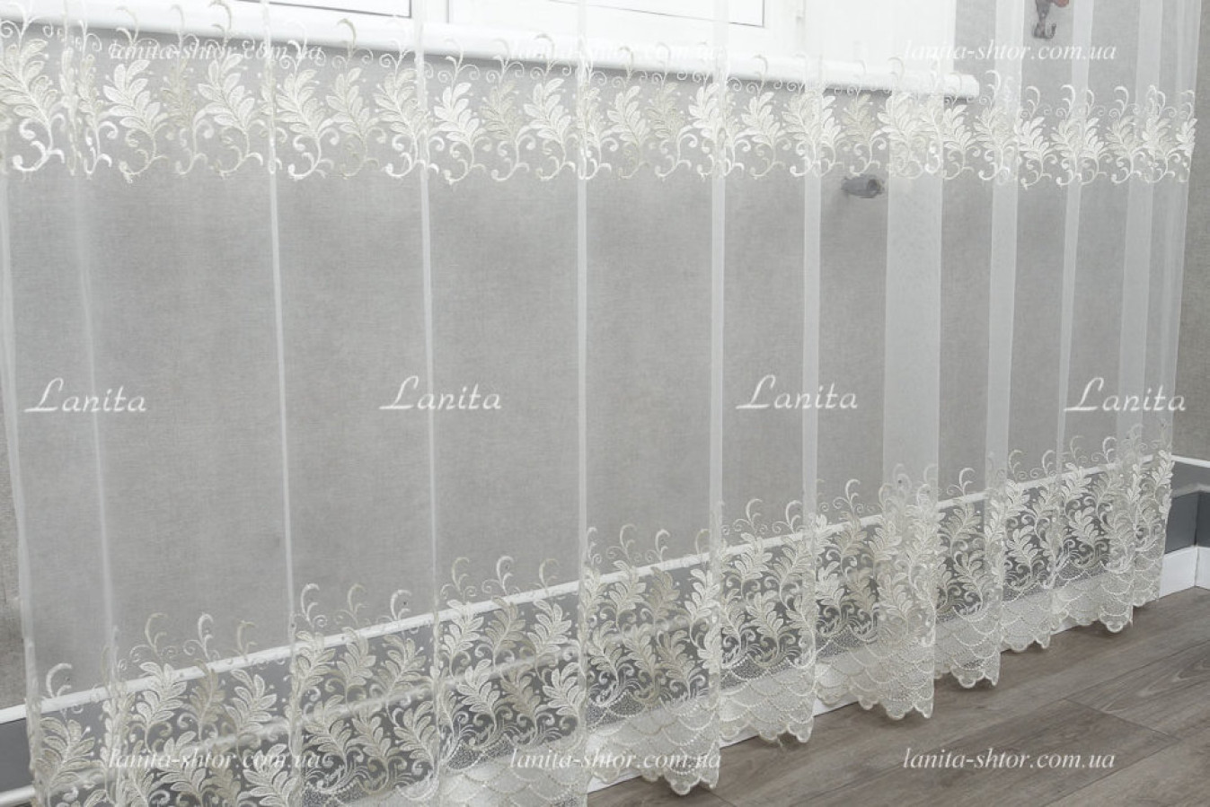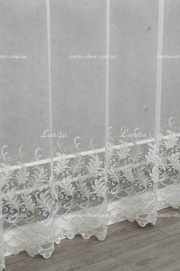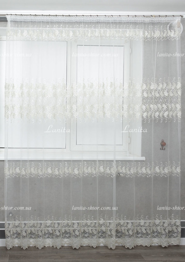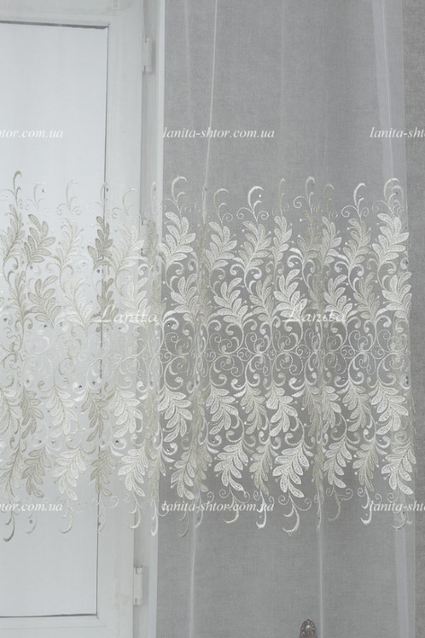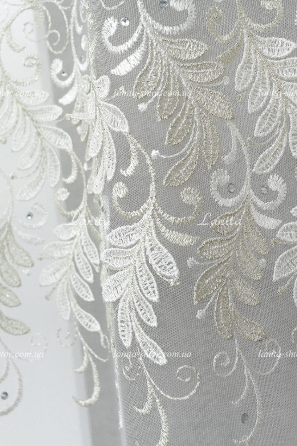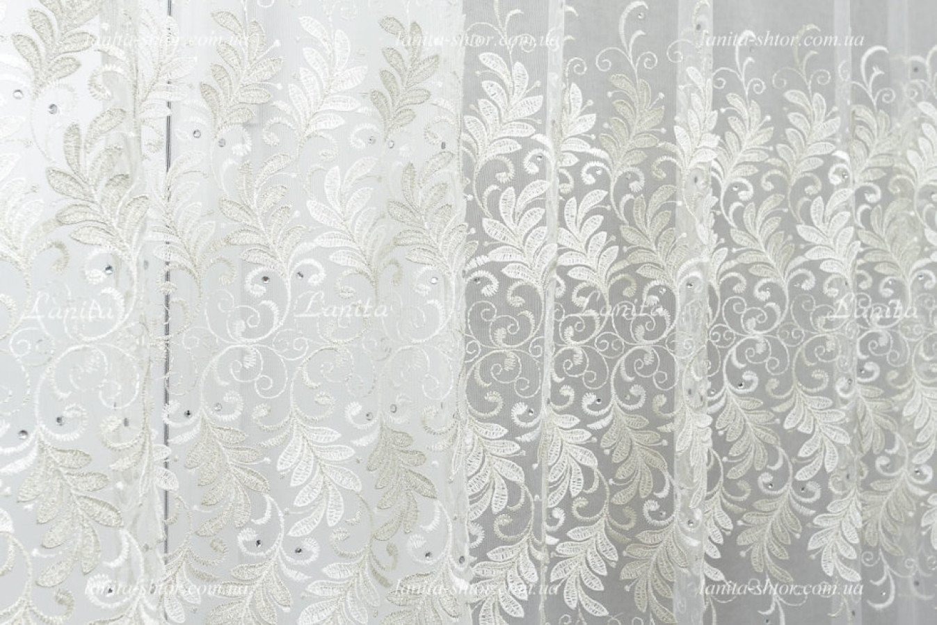 Турецкий тюль фатин с вышитым узором, украшенный стразами. Вышивка выполнена глянцевыми нитями в молочной гамме с включением люрекса. Благодаря богатому декорированию, поверхность гардины приобрела эффектное мерцающее сияние. А легкая, полупрозрачная основа с мелкосетчатой структурой, выступает нежным фоном для красивого орнамента. Отличный вариант для роскошного оформления окон!