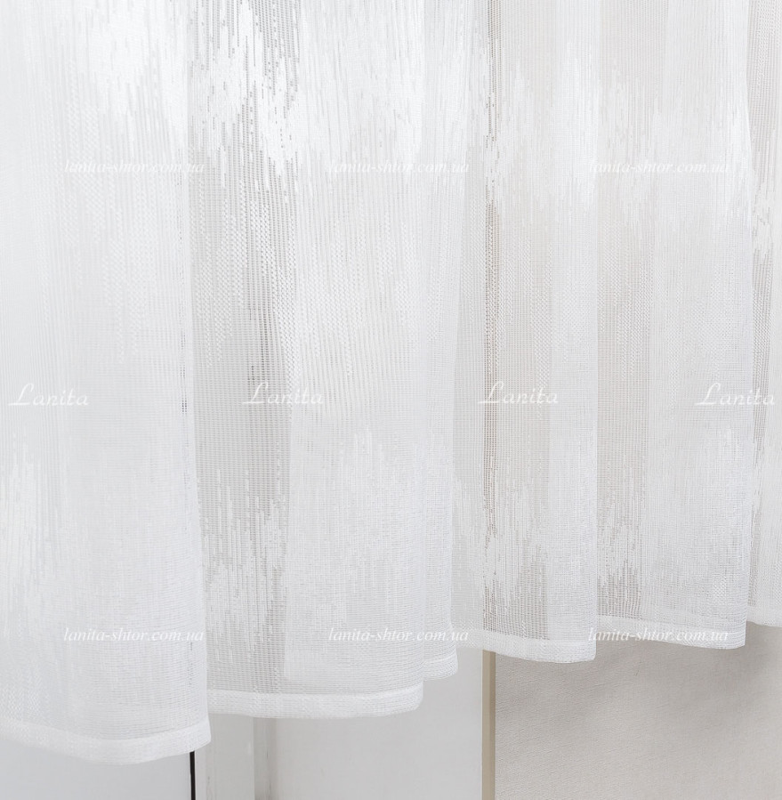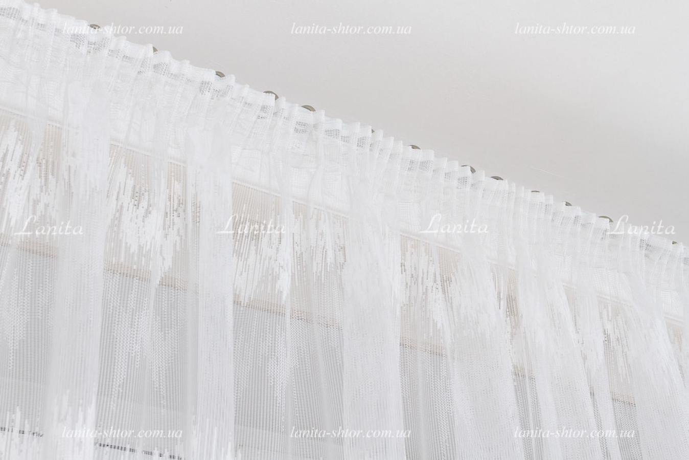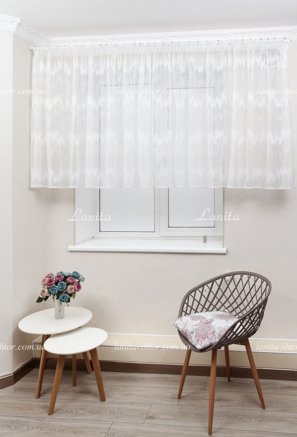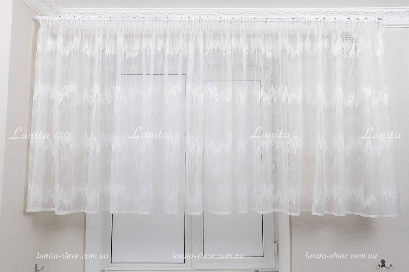 Белая занавесь арка для кухни, пошитая на тесьму из турецкого тюля жаккард.