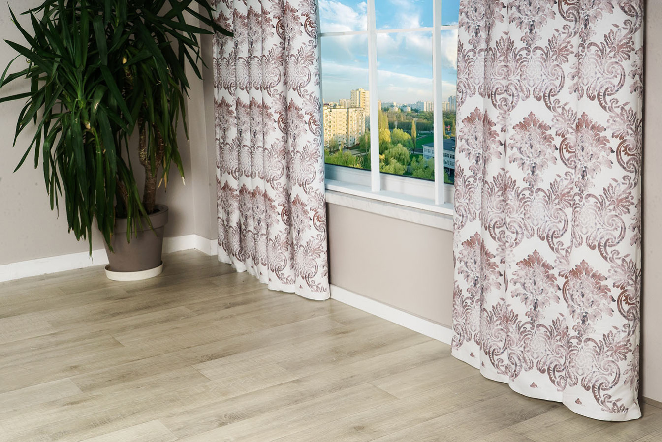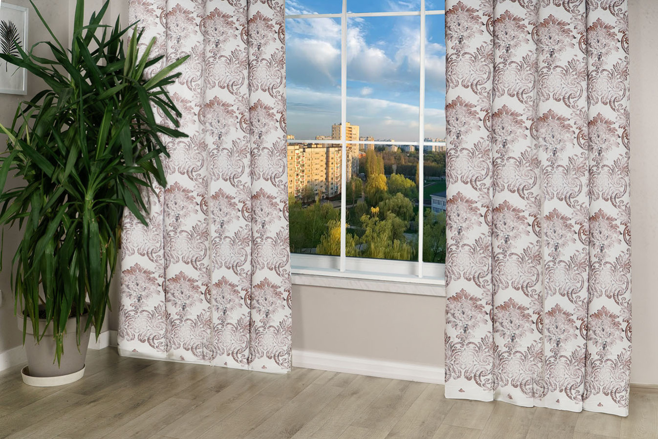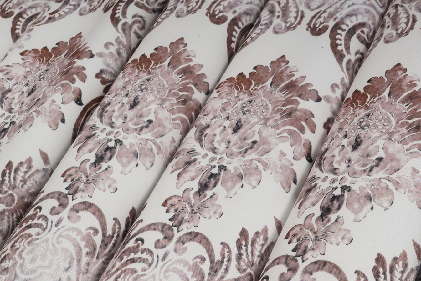 Шторы микровелюр турецкого производства с принтом в виде геральдического узора. Вензельный орнамент имеет слегка размытые очертания, наподобие акварельного рисунка. Портьеры обладают матовой, коротковорсистой, мягкой и приятной на ощупь лицевой поверхностью. По структуре это ткань полотняного плетения средней плотности. Шторы отличаются высочайшим качеством и наилучшими текстильными характеристиками, в драпировках образуют ровные и формоустойчивые складки.