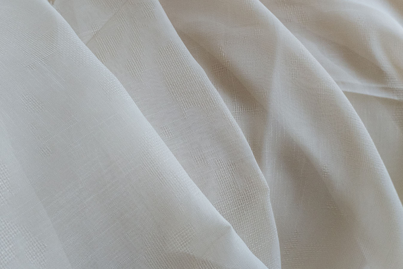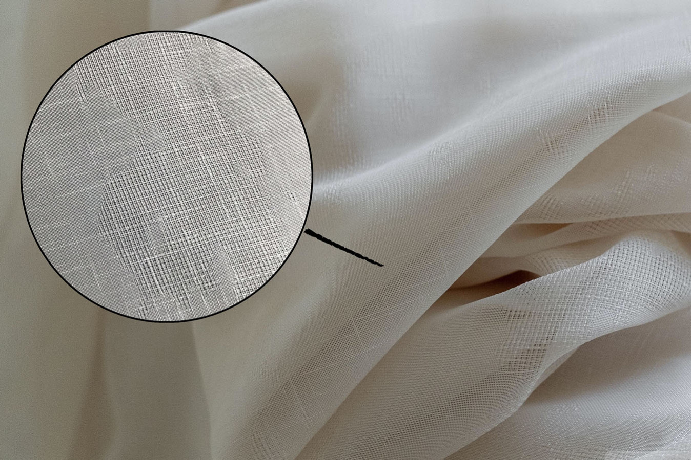 Турецкий тюль под лен с оттиском в кремовом цвете. Ткань обладает выразительной фактурой полотняного плетения с включением утолщенных нитей. Абстрактный рисунок оттиска выполнен в виде сетчатых вставок, придает гардине оригинальный и самобытный вид. Это пластичный и легкий материал с матовой поверхностью, в драпировках создает объемные воздушные воланы. Тюль характеризуется невысокой прозрачностью, что делает его востребованным для оформления окон на первых этажах или солнечной стороне.