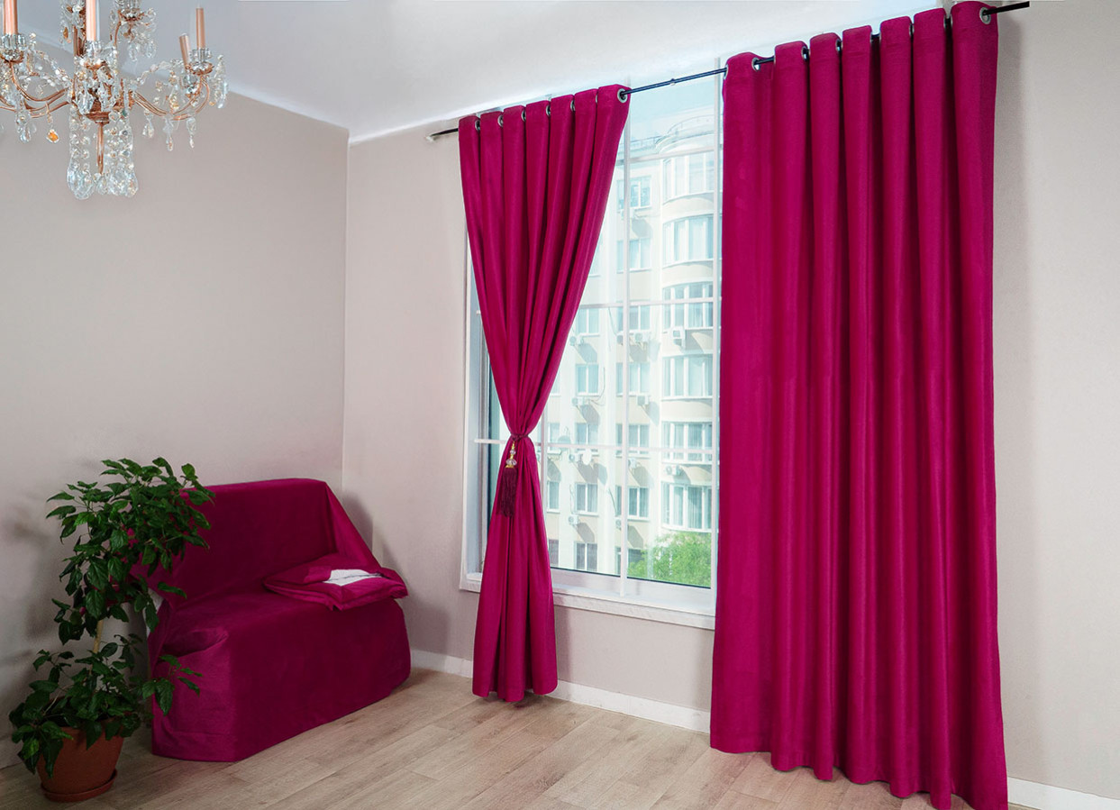 Однотонные шторы из облегченной ткани микробархат насыщенного цвета розовой фуксии. Лицевая сторона материала имеет мягкую, приятную на ощупь ворсистую поверхность. Это очень гибкая и пластичная ткань, позволяющая создавать драпировки различной густоты и формы. На окнах микробархат смотрится очень выразительно и богато, выступает эффектным акцентом в оформлении интерьера.
