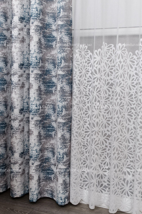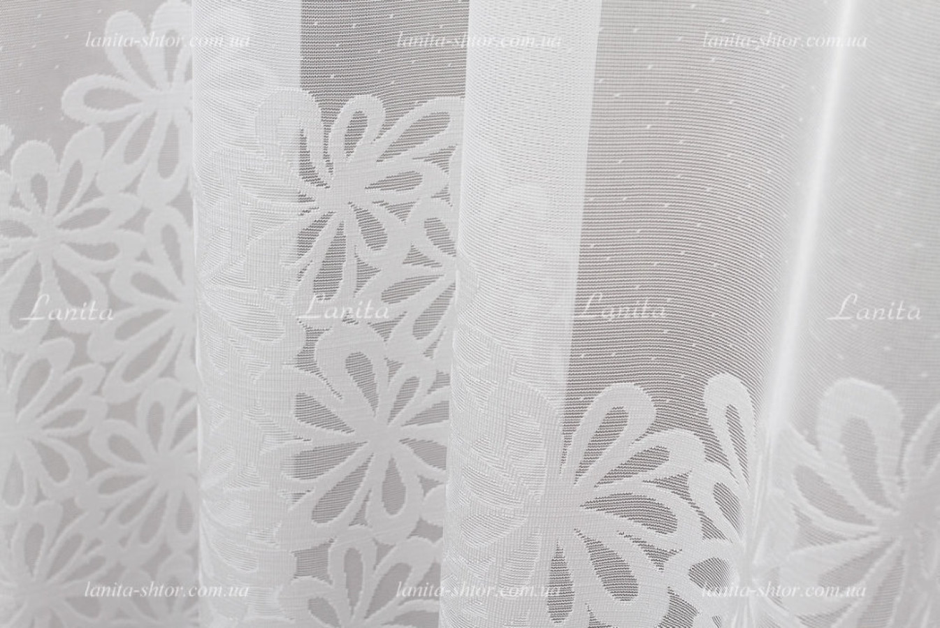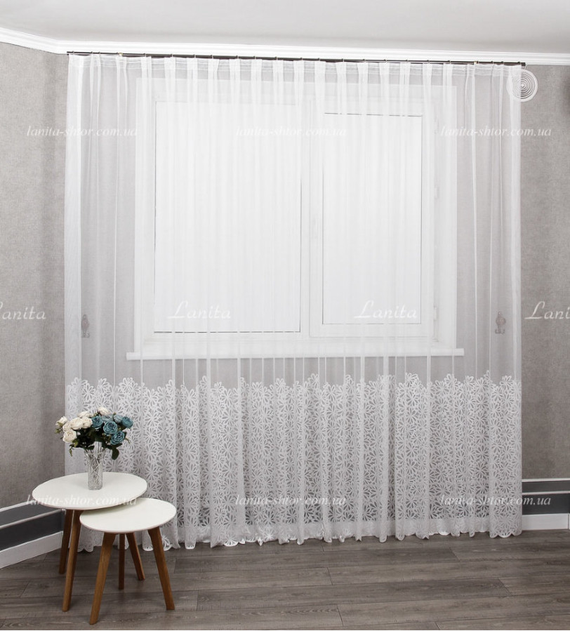 Турецкий тюль жаккард с густым цветочным узором, расположенным по низу полотна купоном. Основа гардины обладает сетчатой структурой с мелкими крапинками. Контуры рисунка имеют плотную и выразительную структуру. Нижний край полотна оформлен как фигурная декоративная кромка. Тюль выглядит нарядно, свежо и эффектно, гармонично сочетается со всеми видами штор.