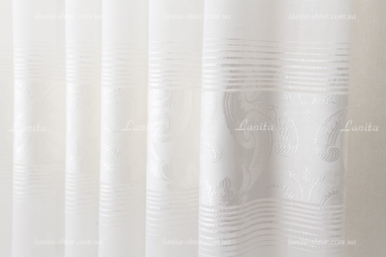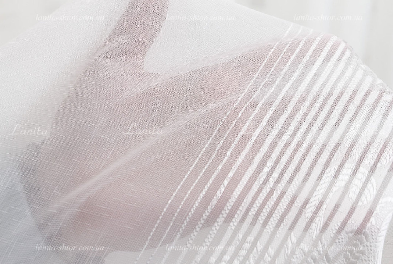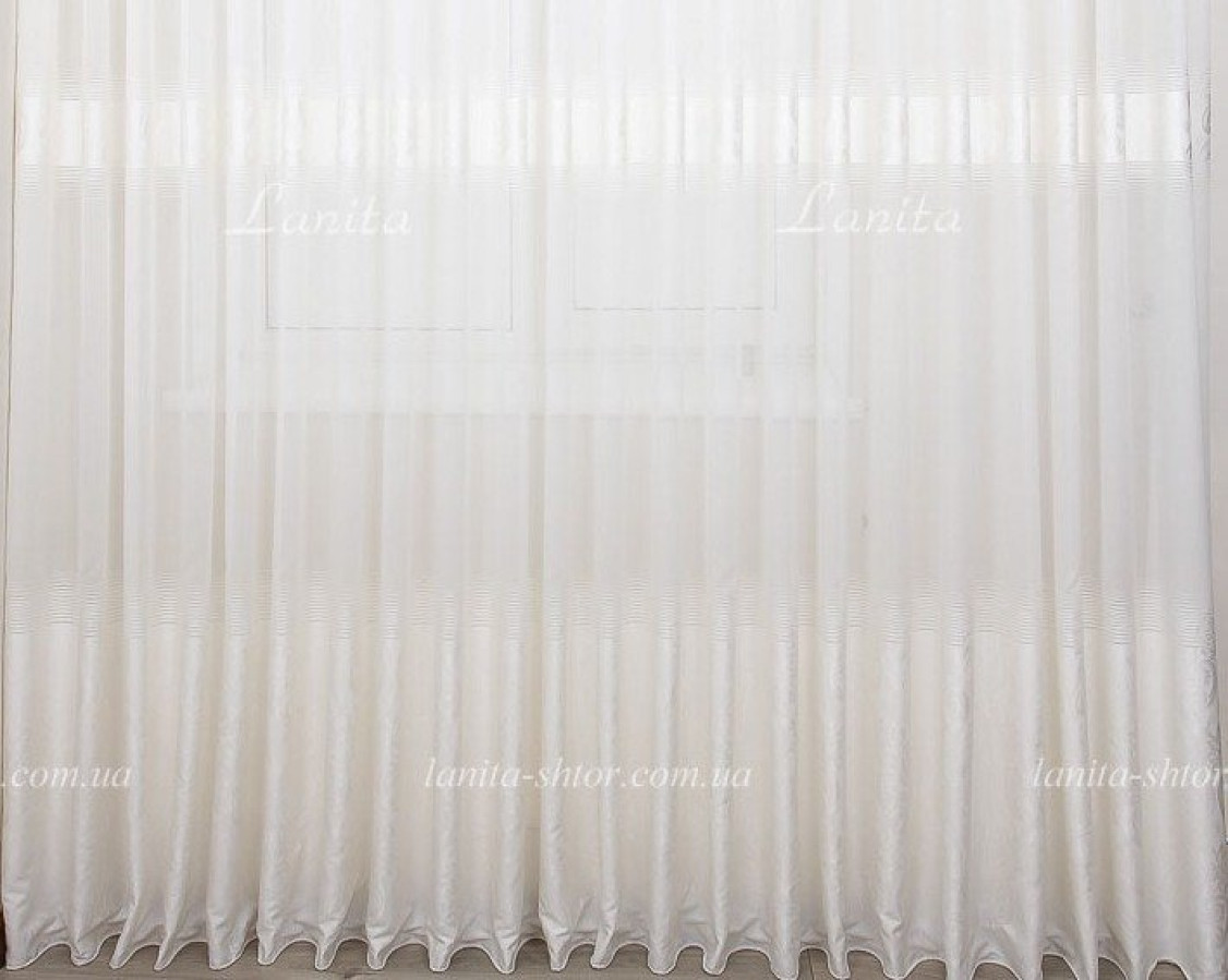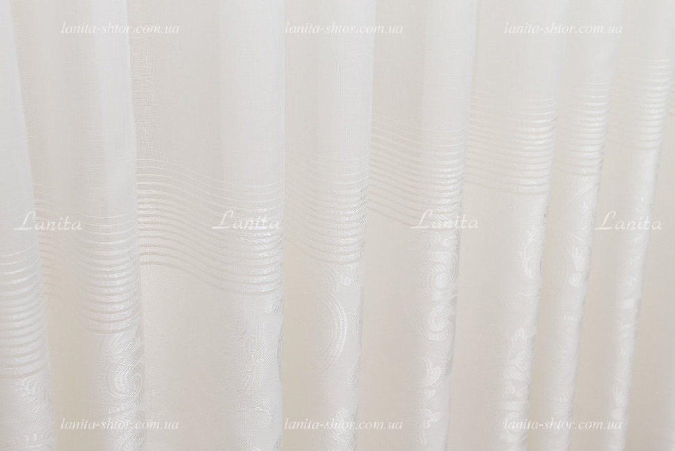 Молочный тюль лен-жаккард с узорчатыми полосами по низу и середине полотна. Основа тюля представляет собой полупрозрачную ткань под лен с матовой поверхностью и выразительным полотняным плетением. Орнамент имеет более плотную структуру и нежное сияние, создан благодаря узорчатому плетению глянцевых волокон. Тюль выглядит свежо и роскошно, станет достойным украшением для любого современного интерьера.