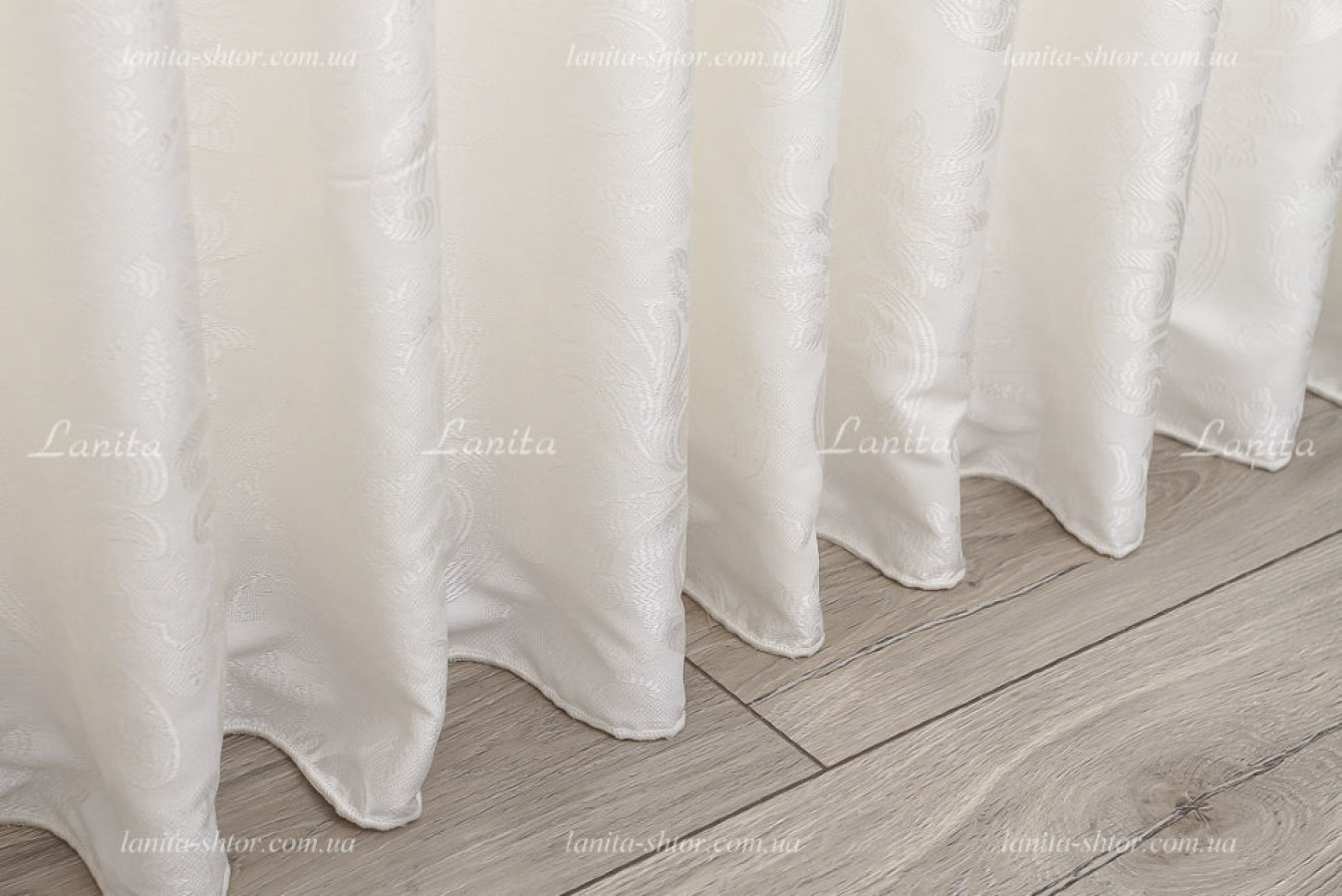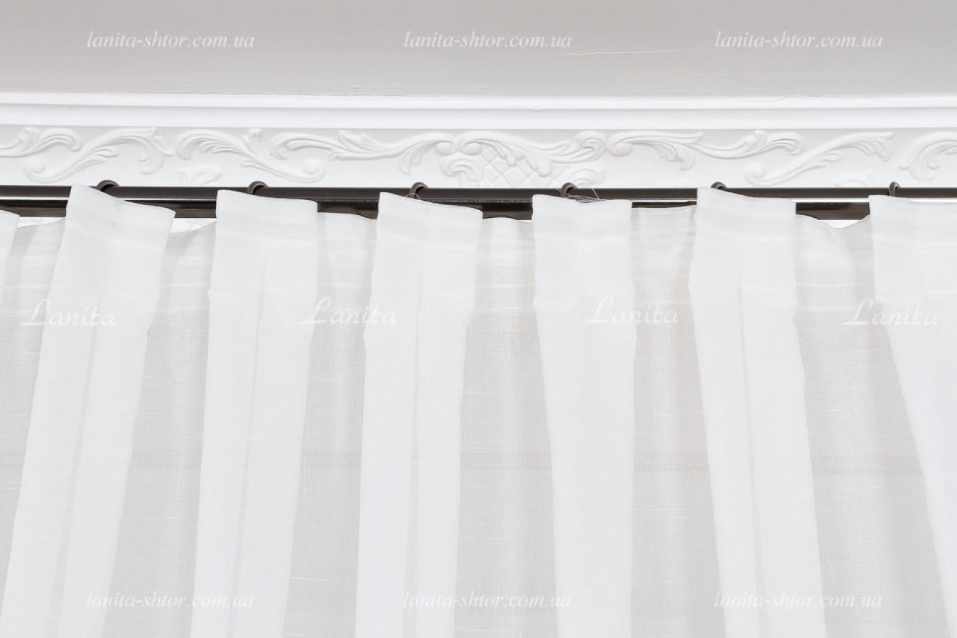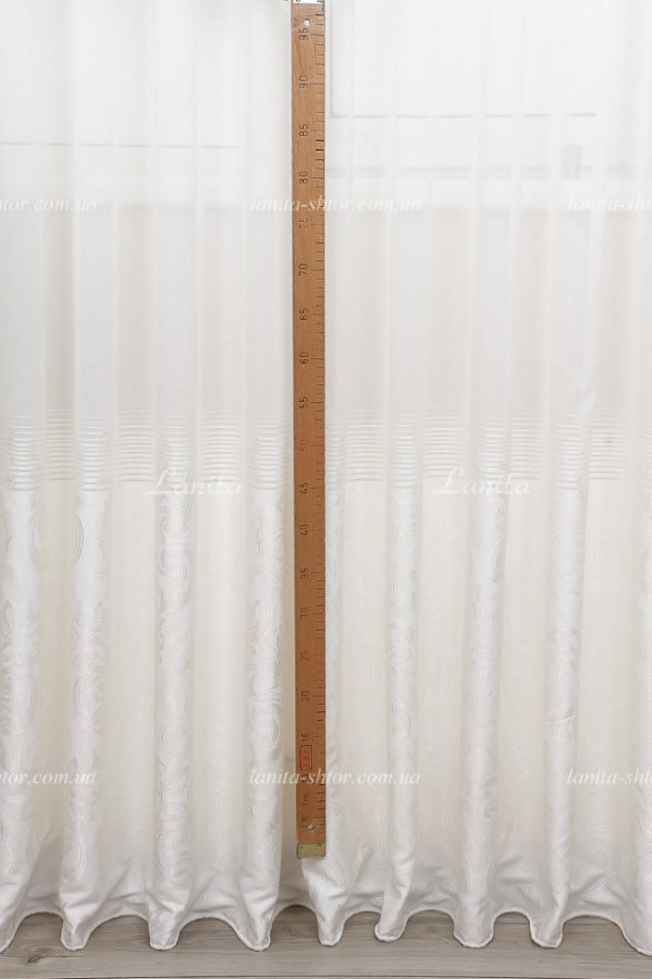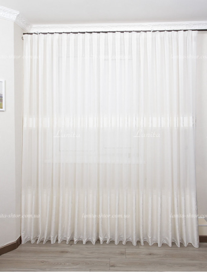 Молочный тюль лен-жаккард с узорчатыми полосами по низу и середине полотна. Основа тюля представляет собой полупрозрачную ткань под лен с матовой поверхностью и выразительным полотняным плетением. Орнамент имеет более плотную структуру и нежное сияние, создан благодаря узорчатому плетению глянцевых волокон. Тюль выглядит свежо и роскошно, станет достойным украшением для любого современного интерьера.