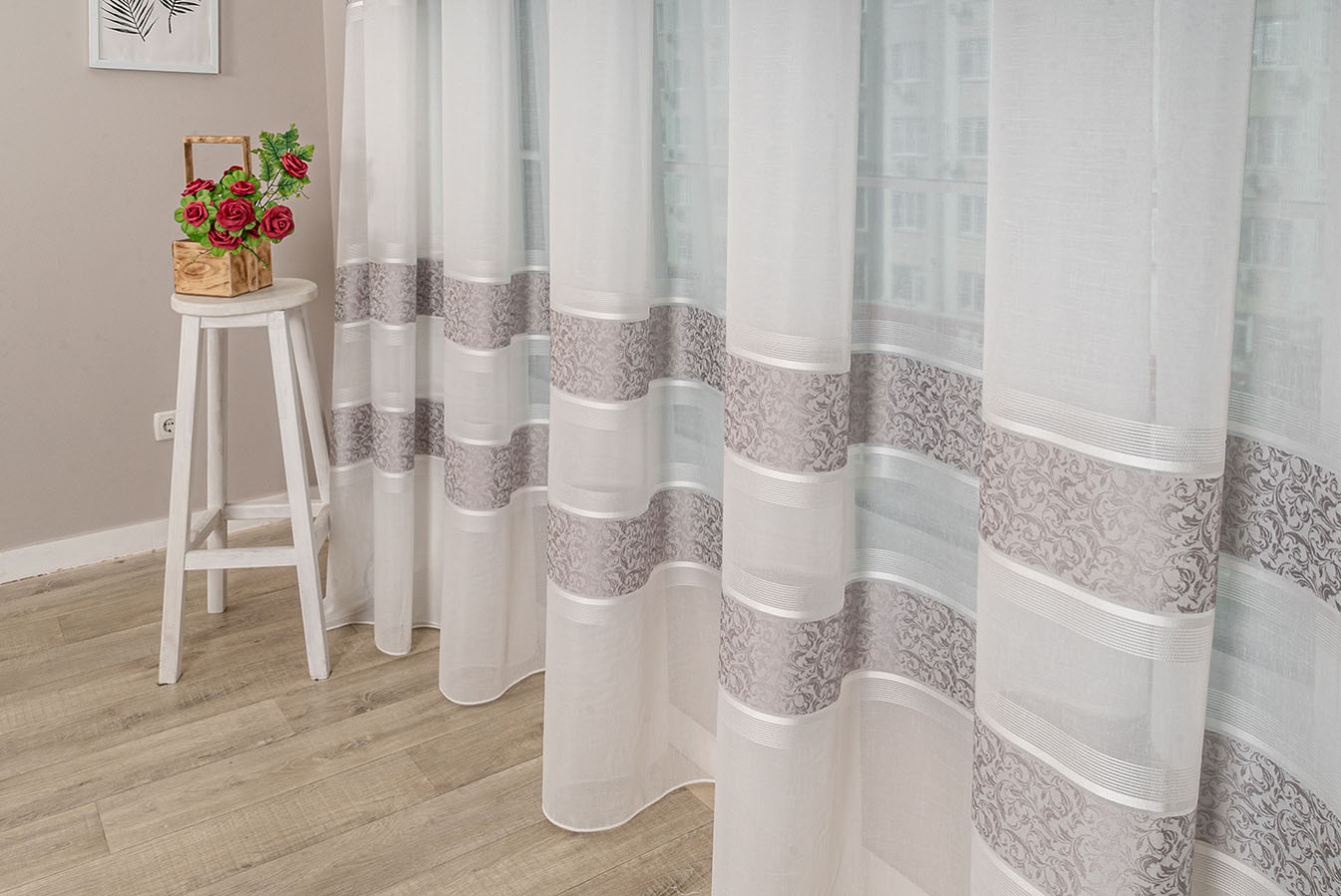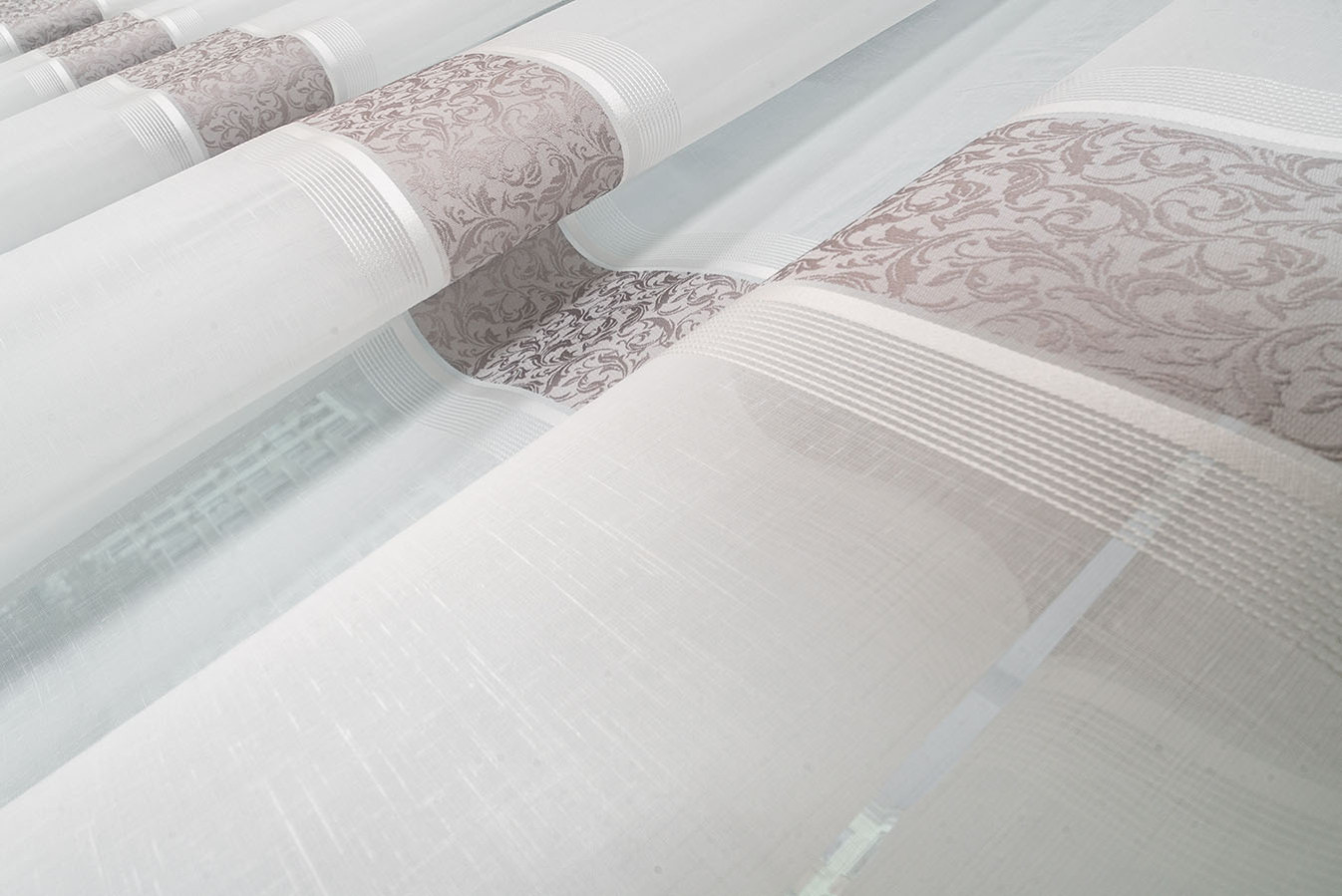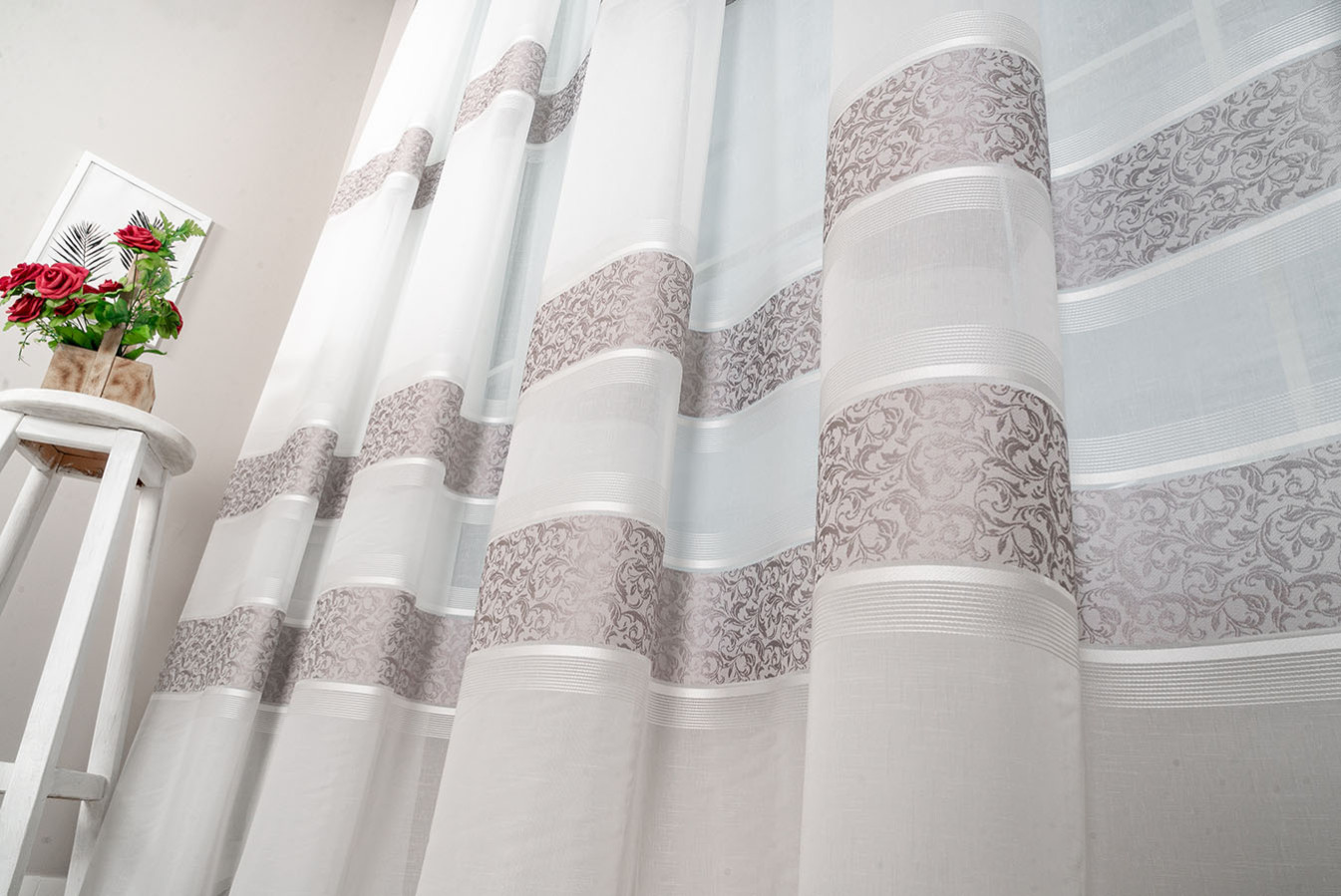 Турецкий тюль на основе ткани под лен с тремя жаккардовыми полосками. Основа гардины представляет собой матовую полупрозрачную ткань с выразительным полотняным плетением нитей. Полоски имеют нежный восковой отлив и плотную структуру с фактурным растительным узором. В драпировках гардина образует объёмные воланы устойчивой формы. Тюль выглядит привлекательно и элегантно, а его стильный дизайн прекрасно впишется в интерьер любого жилого помещения.