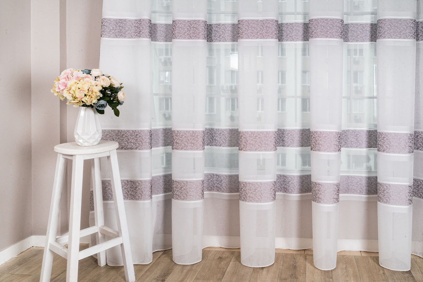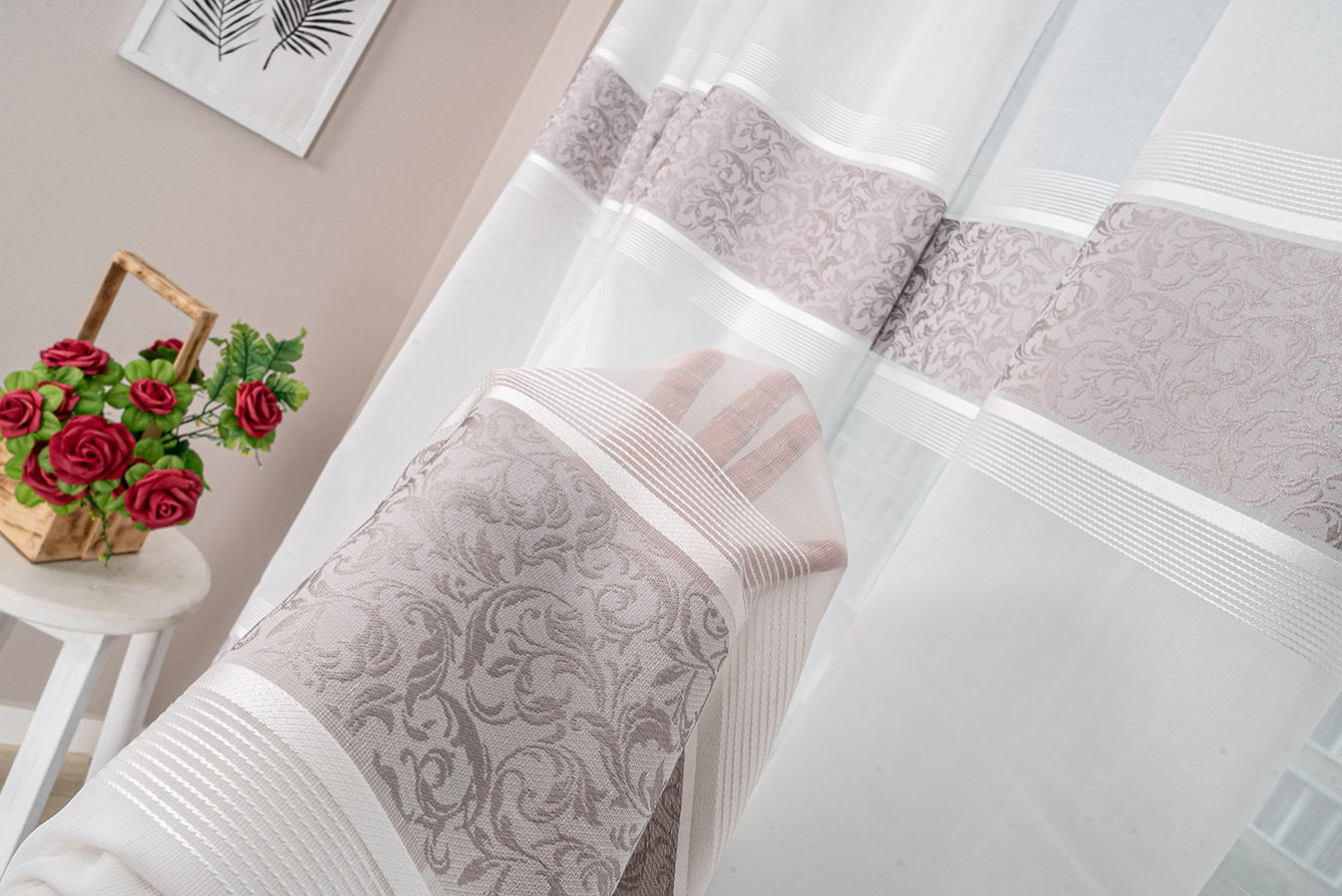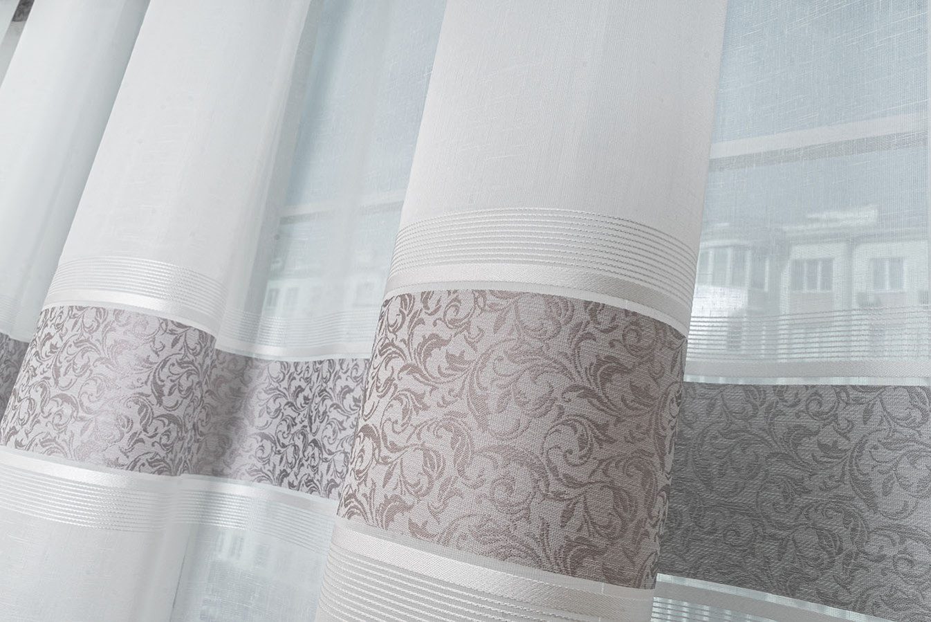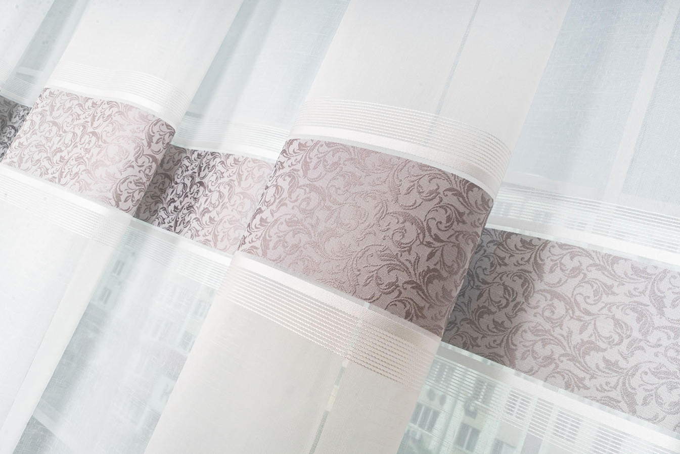 Турецкий тюль на основе ткани под лен с тремя жаккардовыми полосками. Основа гардины представляет собой матовую полупрозрачную ткань с выразительным полотняным плетением нитей. Полоски имеют нежный восковой отлив и плотную структуру с фактурным растительным узором. В драпировках гардина образует объёмные воланы устойчивой формы. Тюль выглядит привлекательно и элегантно, а его стильный дизайн прекрасно впишется в интерьер любого жилого помещения.