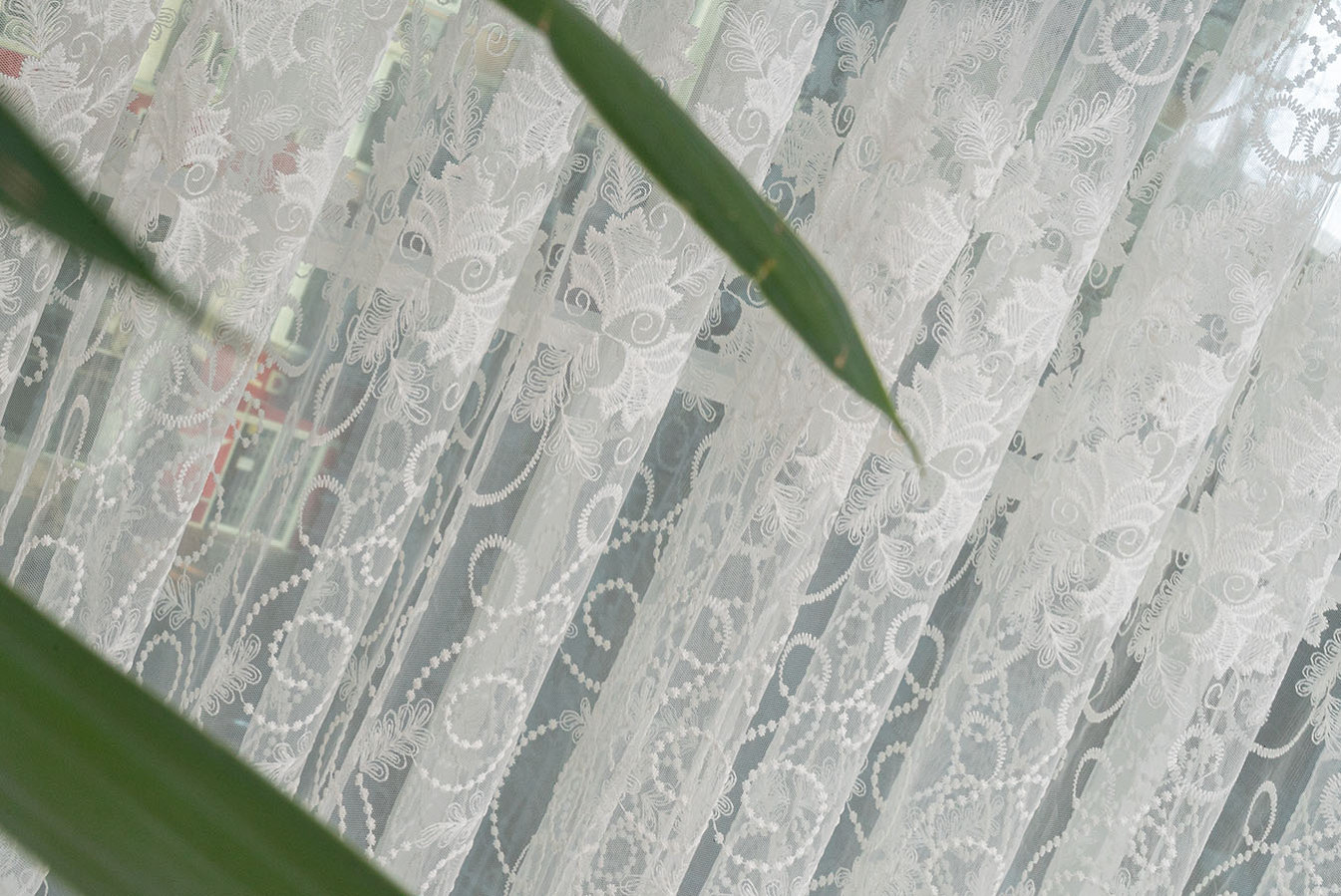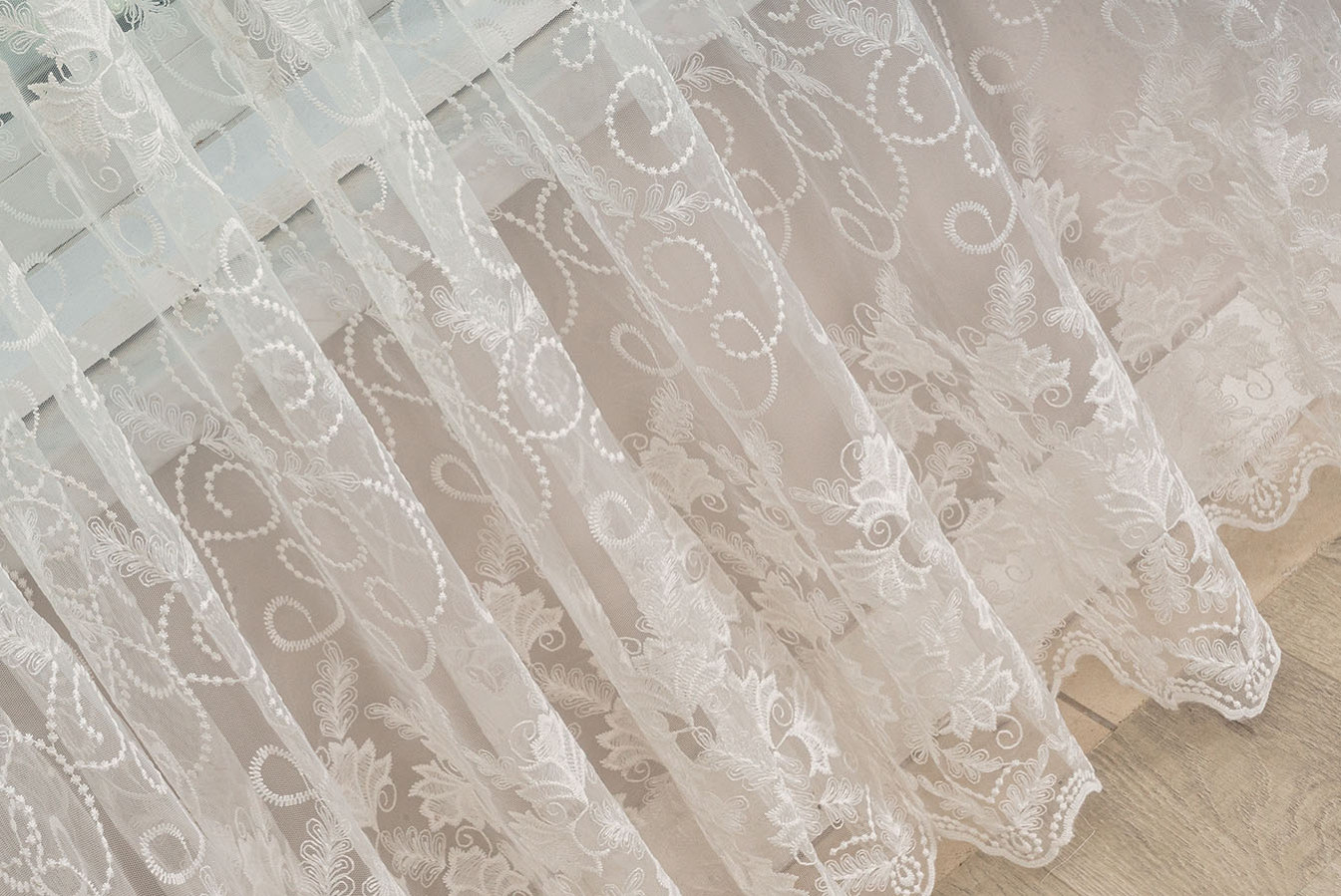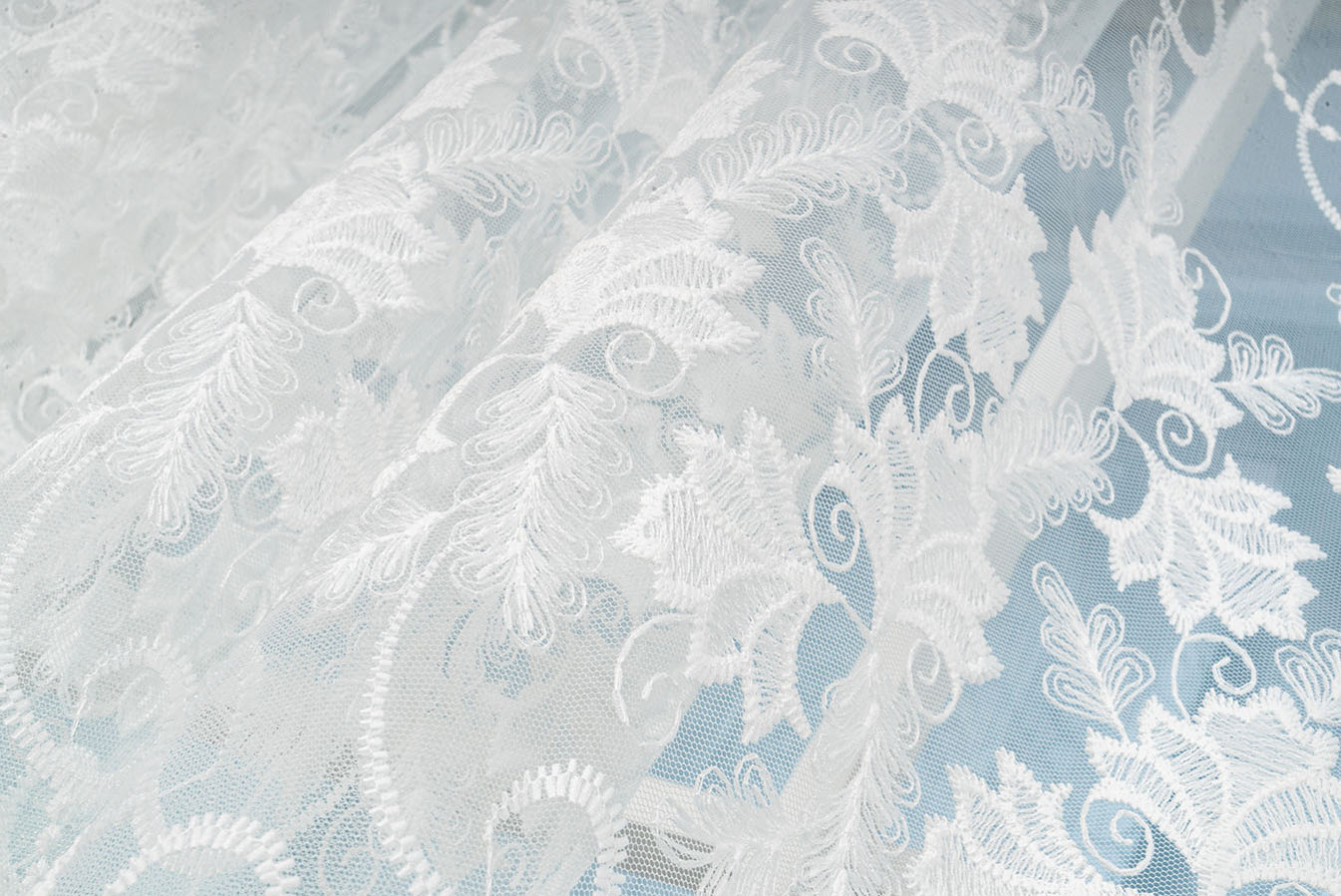 Белый тюль на основе фатина — пластичной, полупрозрачной ткани с мелкосетчатой структурой. Гардина пошита на белые люверсы. Вышивка на таком фоне выглядит очень выразительно и объемно, а матовые нити шитья подчеркивают красоту и рельефы узоров. По низу изделия расположен густой лиственный узор, а волнообразный край обработан плотной декоративной строчкой. Кроме внешней привлекательности данная модель характеризуется прекрасными дышащими свойствами, простотой в уходе и практичностью. Тюль прекрасно впишется во многие современные интерьеры и будет долгое время радовать глаз нежным видом и великолепием дизайна.