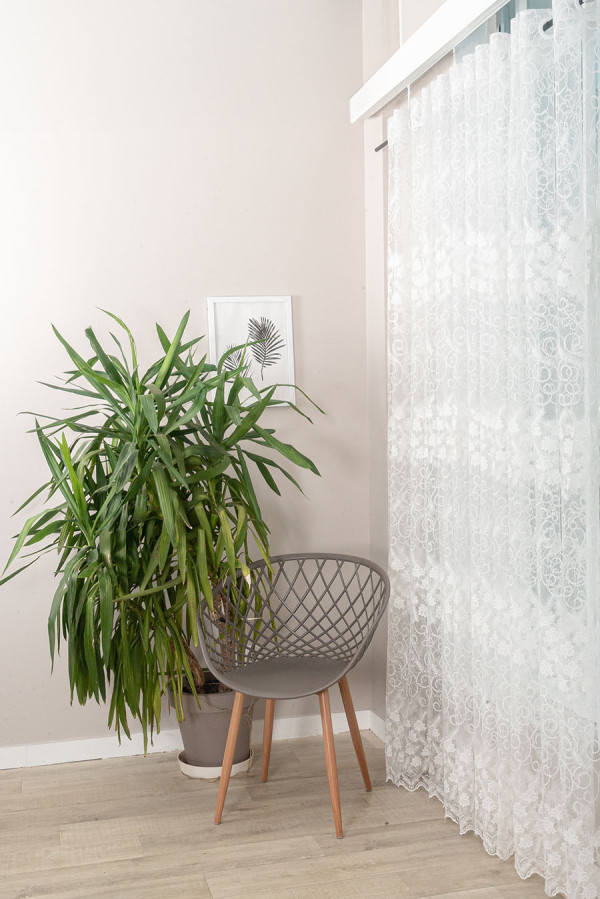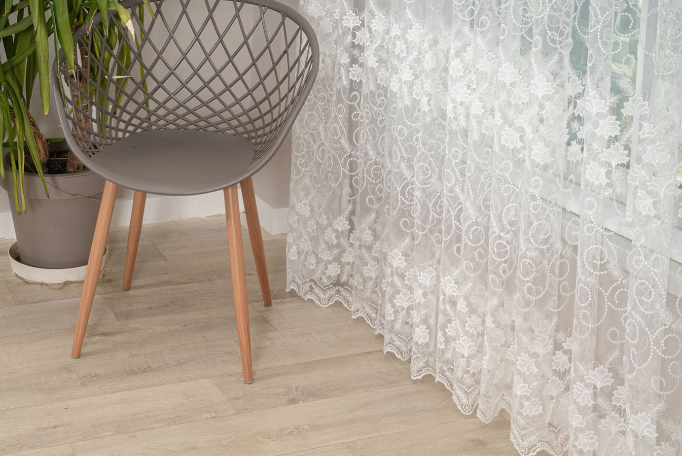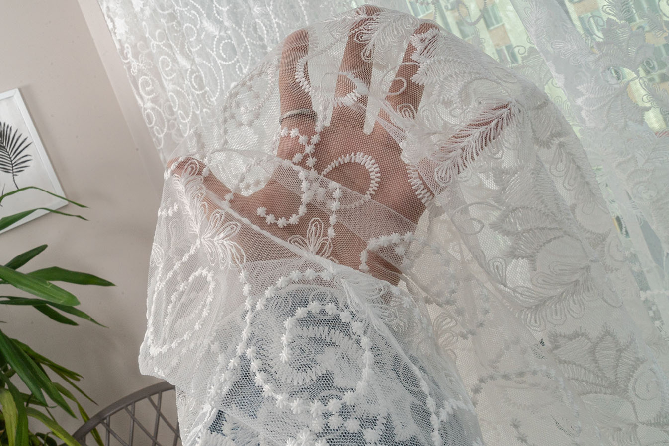Белый тюль на основе фатина — пластичной, полупрозрачной ткани с мелкосетчатой структурой. Гардина пошита на белые люверсы. Вышивка на таком фоне выглядит очень выразительно и объемно, а матовые нити шитья подчеркивают красоту и рельефы узоров. По низу изделия расположен густой лиственный узор, а волнообразный край обработан плотной декоративной строчкой. Кроме внешней привлекательности данная модель характеризуется прекрасными дышащими свойствами, простотой в уходе и практичностью. Тюль прекрасно впишется во многие современные интерьеры и будет долгое время радовать глаз нежным видом и великолепием дизайна.