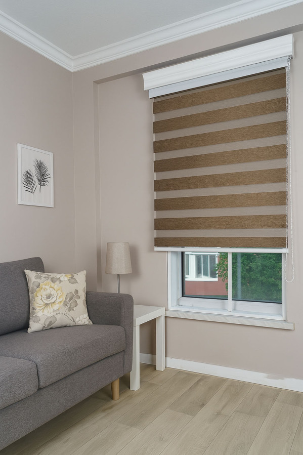 Рулонные шторы "День-Ночь" – стиль и управление светом в одном решении Рулонные шторы "день-ночь" — это идеальное сочетание функциональности и современного дизайна. Благодаря чередованию прозрачных и плотных полос, они позволяют точно регулировать уровень освещения в помещении без необходимости полностью открывать штору. Модель на фото выполнена в тёплом древесном оттенке, который отлично сочетается с интерьерами в стиле минимализм, скандинавский или модерн.