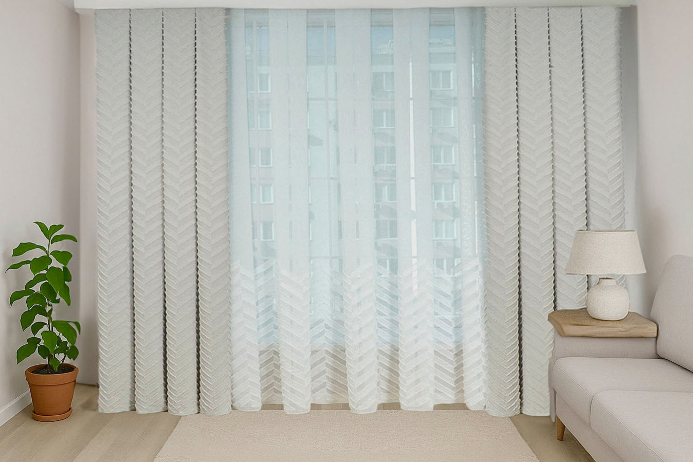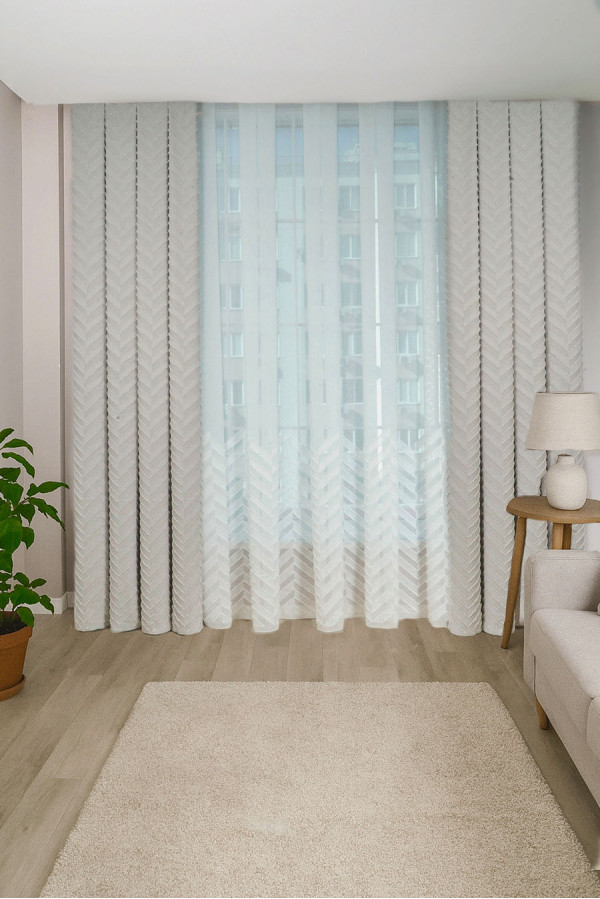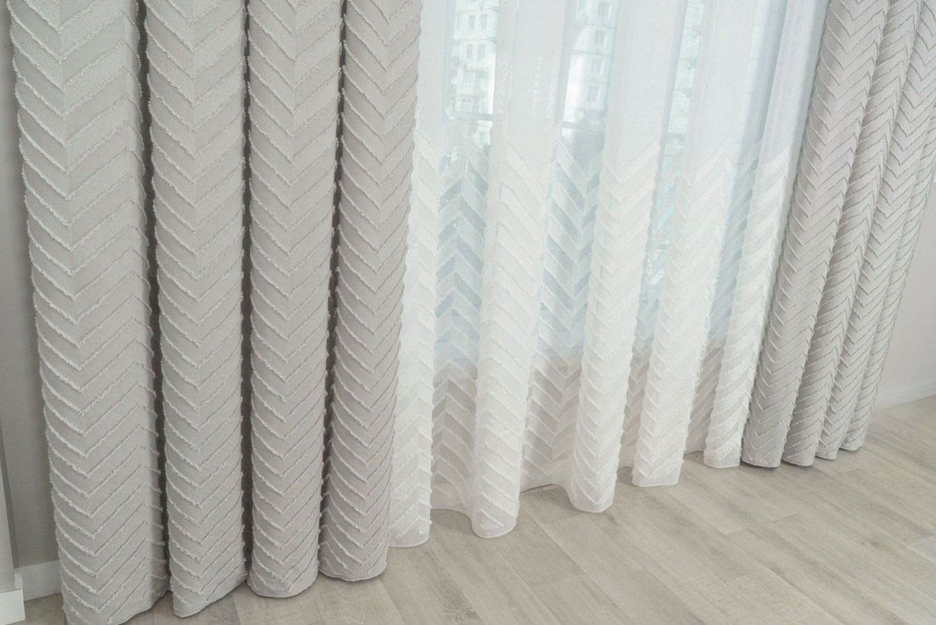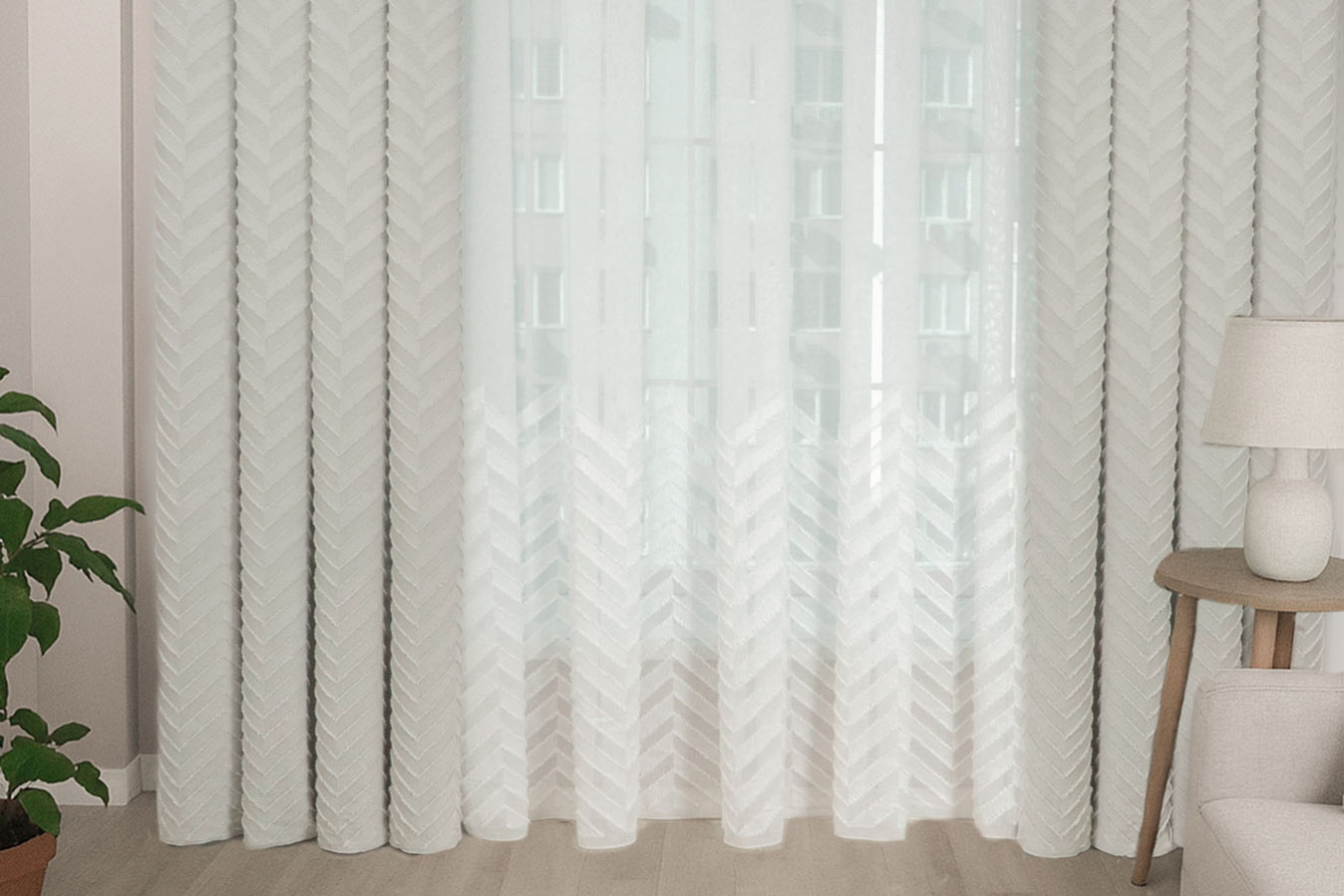 Особое внимание привлекает выразительная фактура с геометрическим узором в виде рельефных «елочных» линий. Такой дизайн придает шторам объем и делает их стильным акцентом в современном или скандинавском интерьере.
