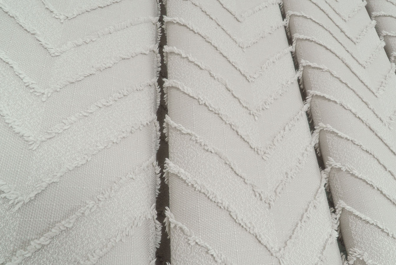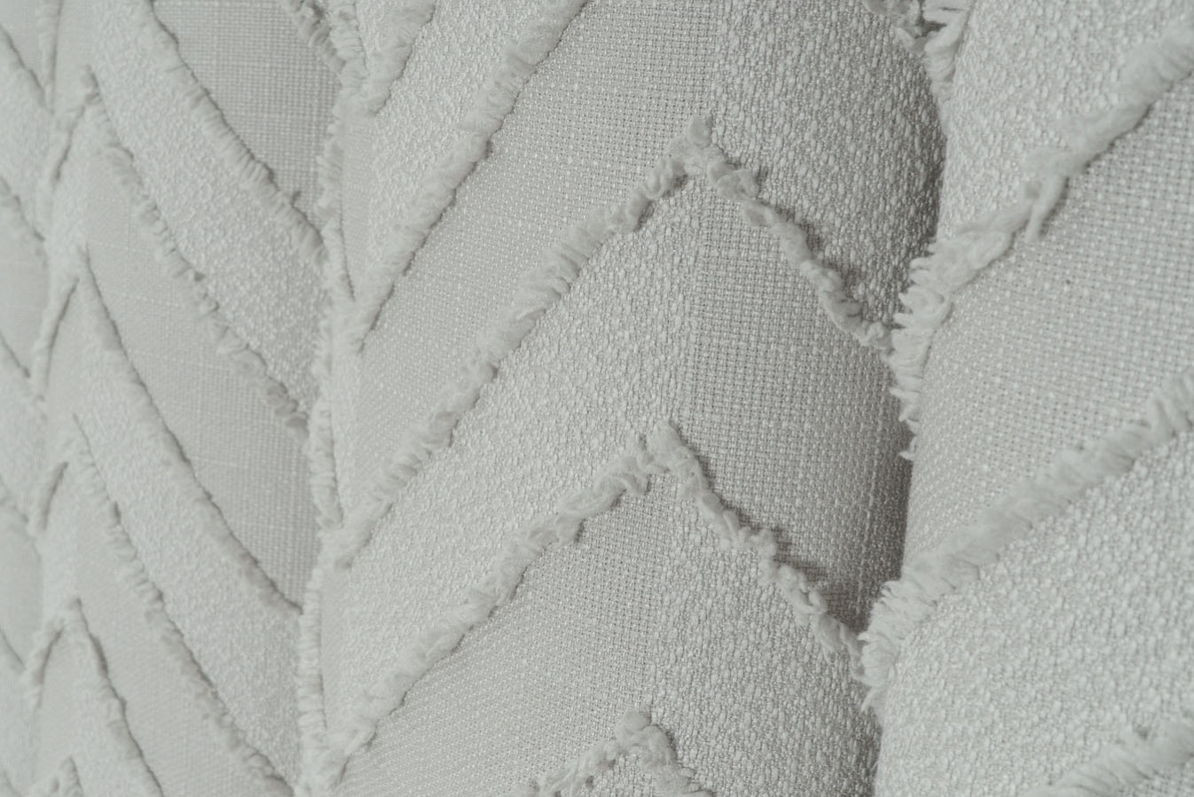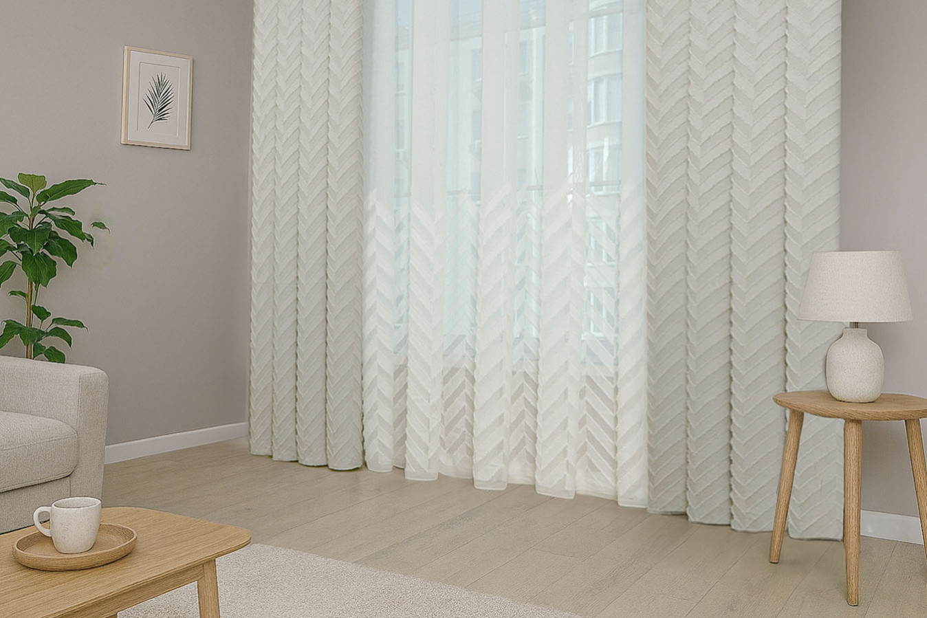 Особое внимание привлекает выразительная фактура с геометрическим узором в виде рельефных «елочных» линий. Такой дизайн придает шторам объем и делает их стильным акцентом в современном или скандинавском интерьере.