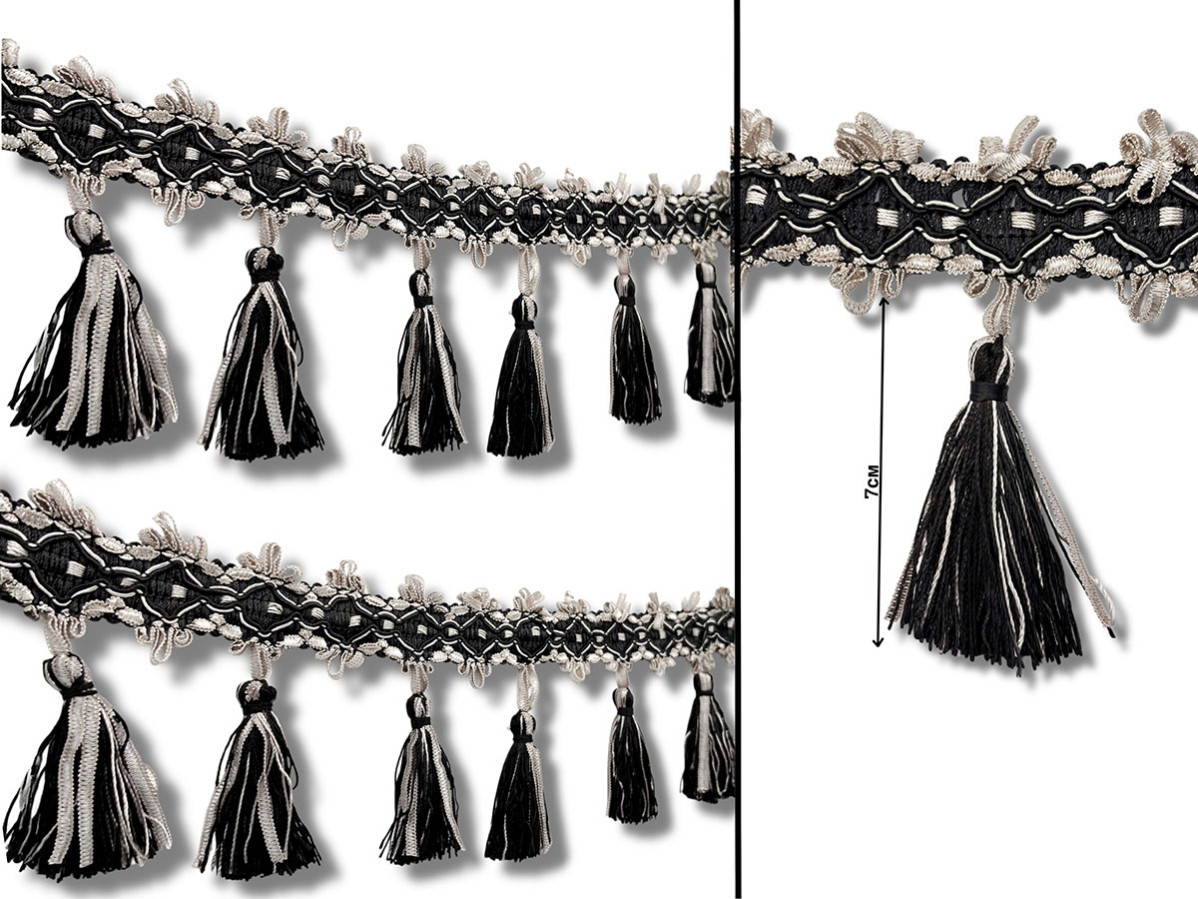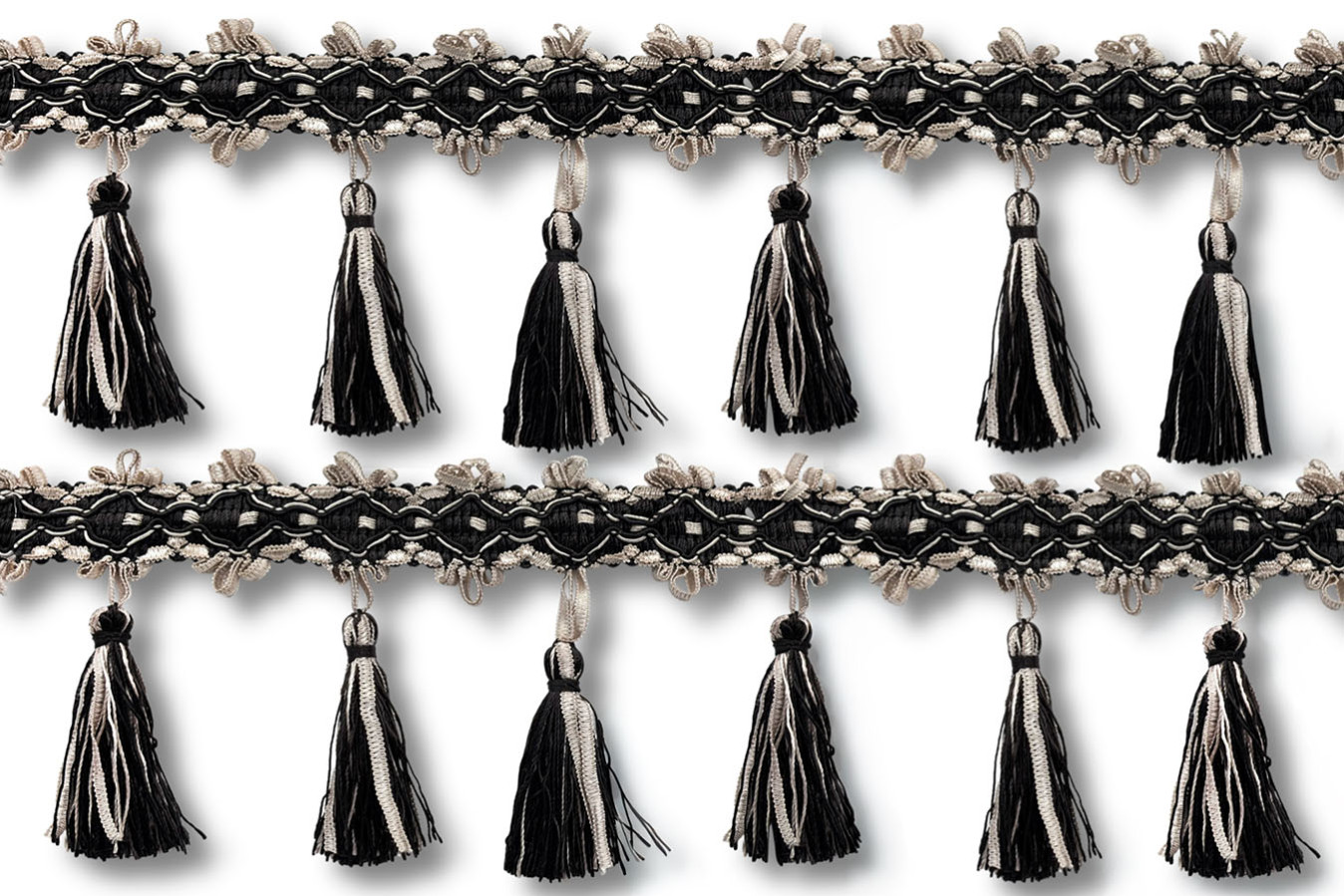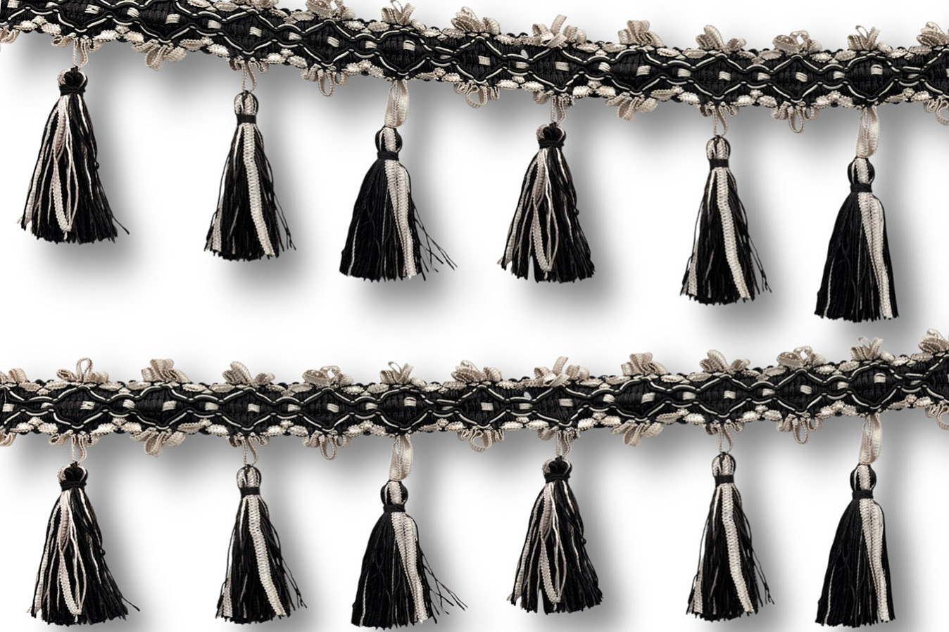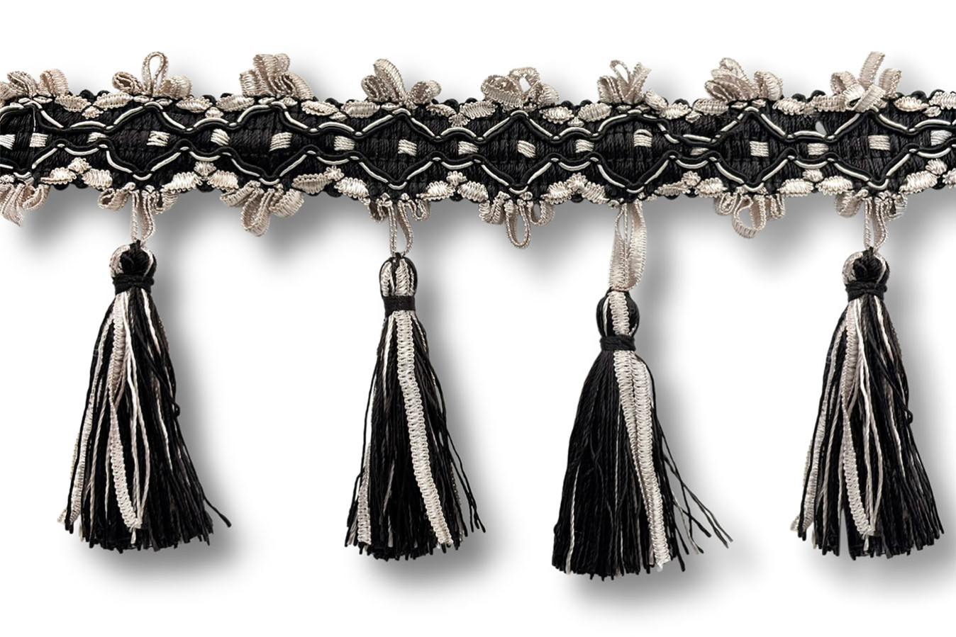 Бахрома для штор с подвесками в виде кисточек, выполненная в чёрно-бежевом сочетании. Верхняя часть украшена декоративным плетением с объёмными элементами, придающими фактурность и изысканность. Подвески состоят из пышных нитяных кистей, которые красиво спадают вниз, создавая эффект роскошного текстильного декора. Такая бахрома прекрасно подчеркнёт как классические, так и современные интерьеры, придавая шторам элегантность и завершённый вид.