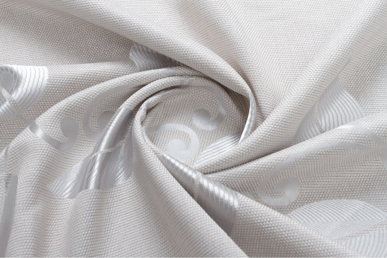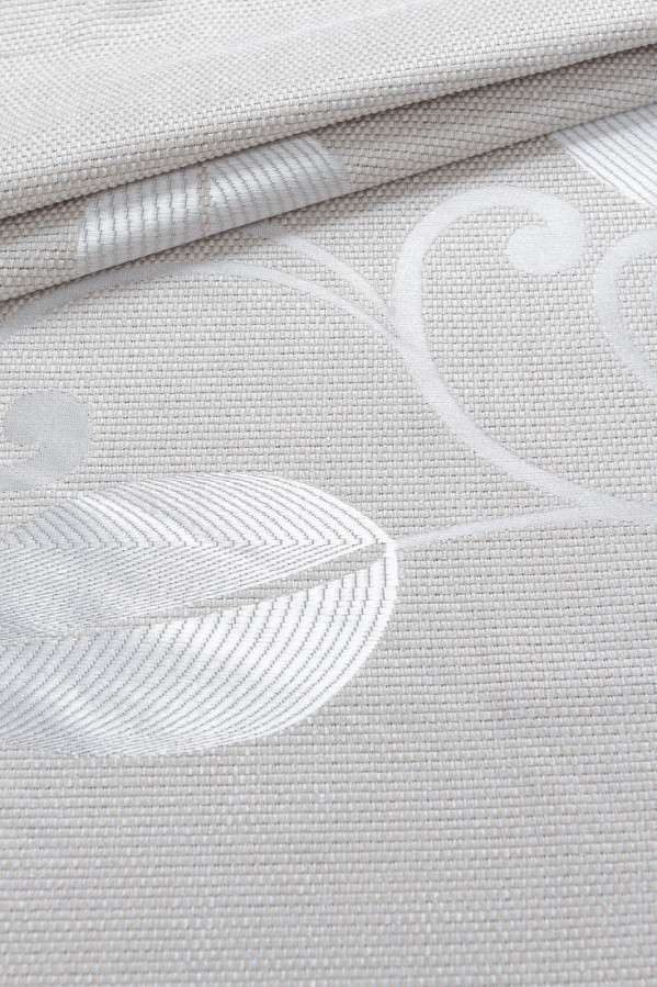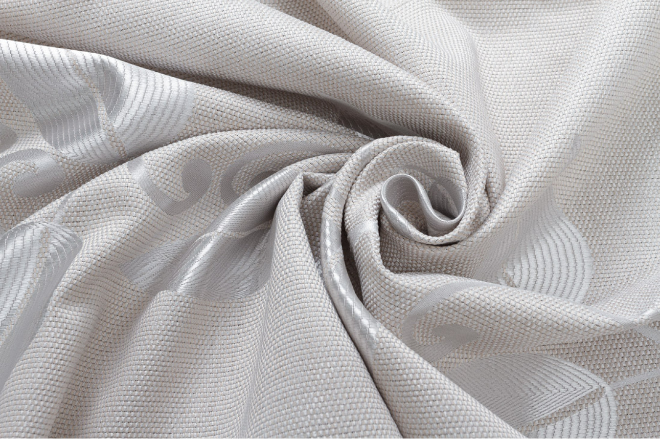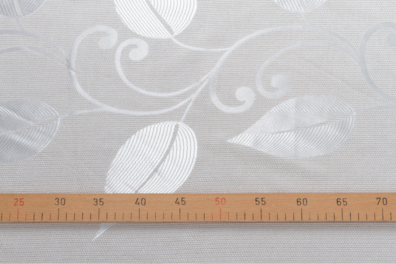 Шторы блэкаут двухсторонние украшены крупным, горизонтально расположенным лиственным орнаментом. Одна из сторон блэкаута имеет фактурную матовую поверхность с отчетливым полотняным переплетением волокон, наподобие рогожки. Узор выполнен благодаря вплетению блестящих шелковистых нитей в основу. Другая сторона ткани обладает гладким, нежно сияющим фоном и матовым узором. Шторы смотрятся очень эффектно и выразительно, к тому же, благодаря своей плотности и слоистой структуре хорошо защищают от солнца.