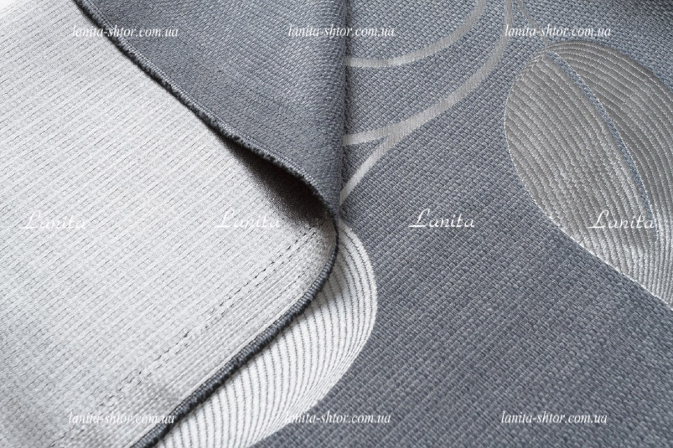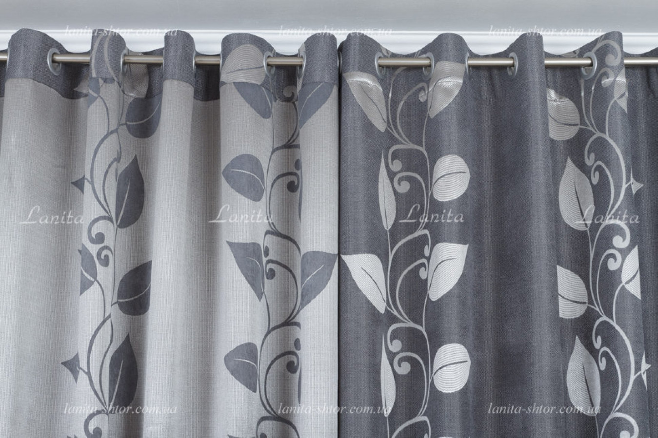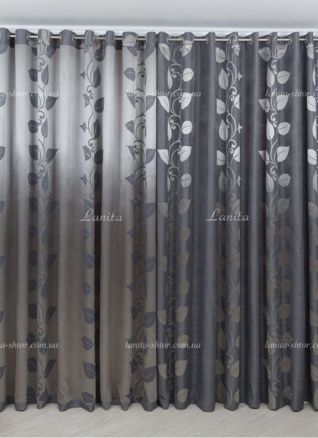 Темно-серые с дымчато-сизым оттенком шторы блэкаут в двухстороннем исполнении. Шторы декорированы крупным, горизонтально расположенным лиственным орнаментом. Одна сторона блэкаута имеет фактурную матовую поверхность с ярко выраженным полотняным переплетением волокон, что делает ее похожей на рогожку. А узор выполнен благодаря вплетению блестящих шелковистых нитей. Другая сторона ткани обладает гладким, нежно сияющим фоном и матовым узором. Шторы выглядят очень оригинально и эффектно, к тому же, благодаря своей плотности и слоистой структуре хорошо защищают от солнца.