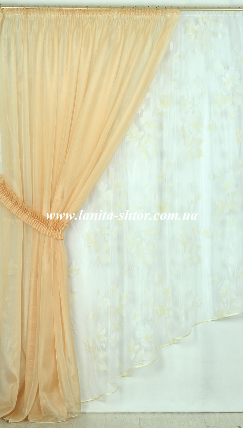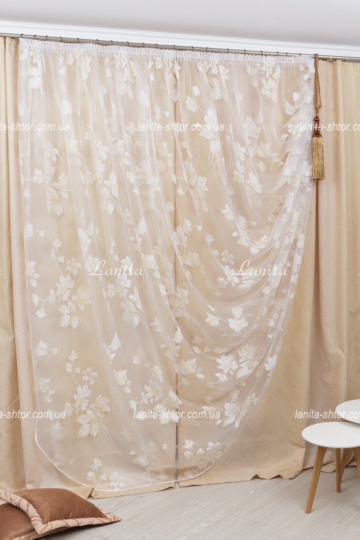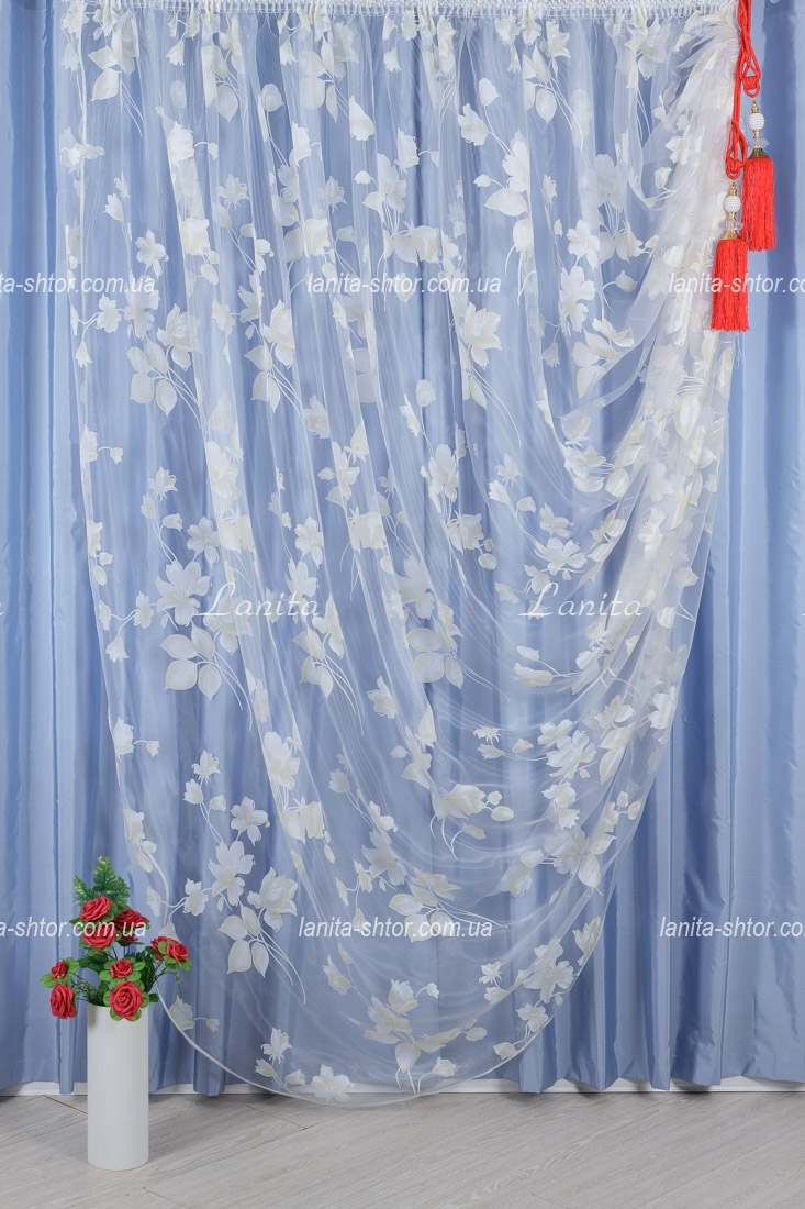 Гардина на основе прозрачной органзы, украшенная цветочными мотивами, созданными по специальной технологии деворе. Этот способ нанесения рисунка обеспечивает стойкий к износу и очень реалистичный узор, отличающийся плотной и непрозрачной структурой. В результате получается удивительный по красоте визуальный эффект парящих в воздухе цветов. А жесткость органзовой основы обеспечивает объемные и воздушные складки устойчивой формы.